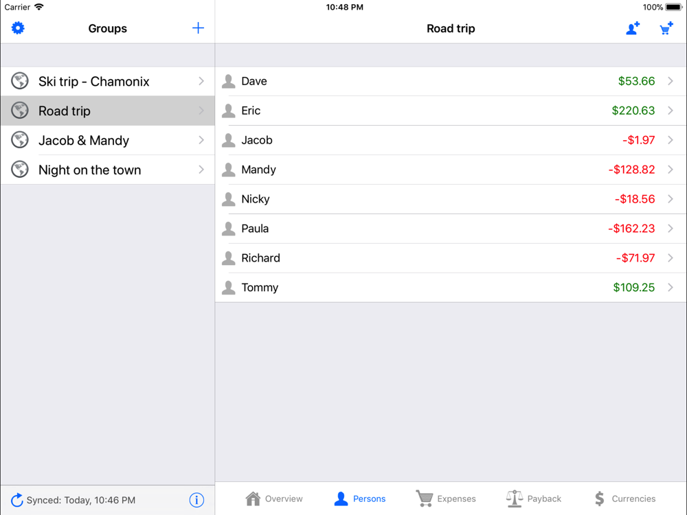 Cost Split helps you share costs within a group of people where each person can add expenses from their own devices thanks to the cloud sync.