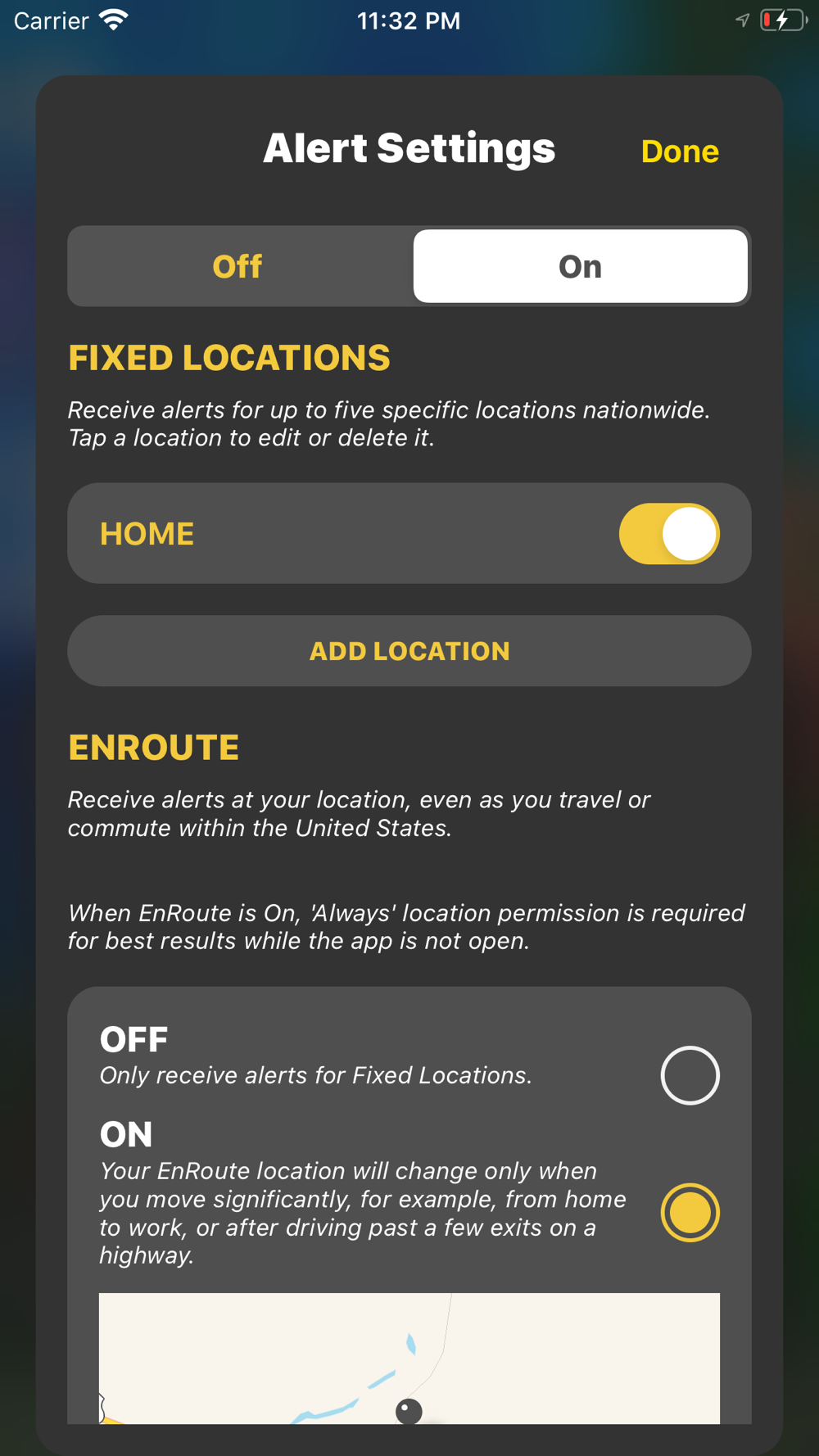 In addition to monitoring fixed locations, the “EnRoute” feature allows you to receive severe weather alerts while on the go! Simply enable EnRoute and the app will track your location and alert you if you drive into a warned area, whether you know your exact location or not!