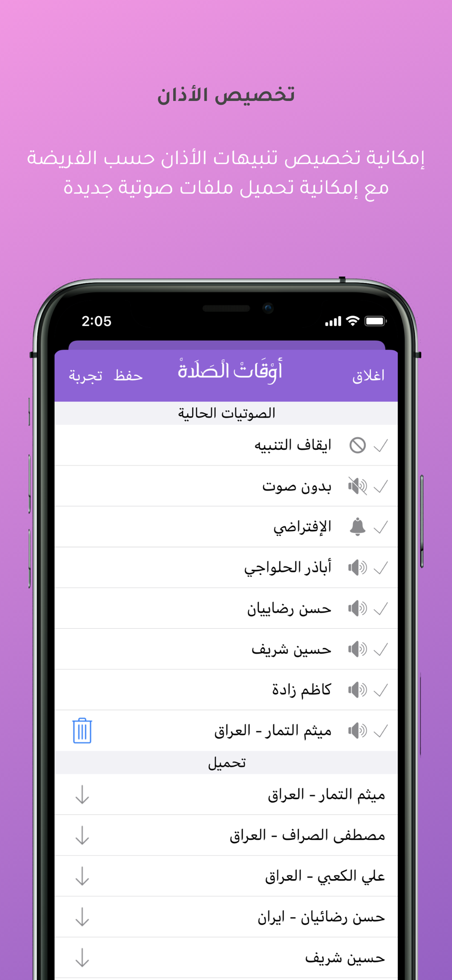 - المؤذن بشكل تلقائي غير مفعل يمكنك تفعيل المؤذن من شاشة الإعدادات ولكي يعمل الصوت حدد صوت المؤذن المفضل لديك.