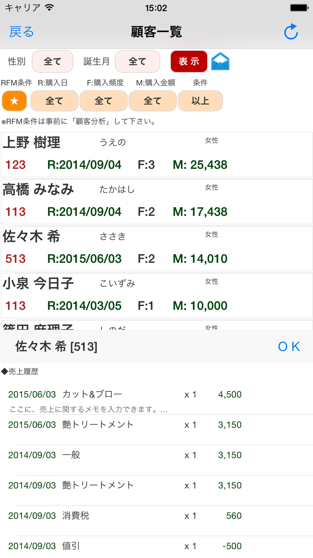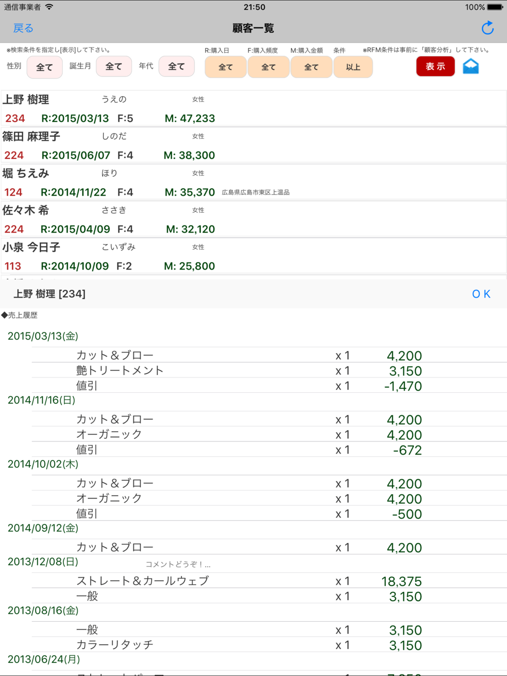 お釣り計算の他、顧客売上履歴やRFM分析に基づいた顧客検索一覧ができるようになっています。