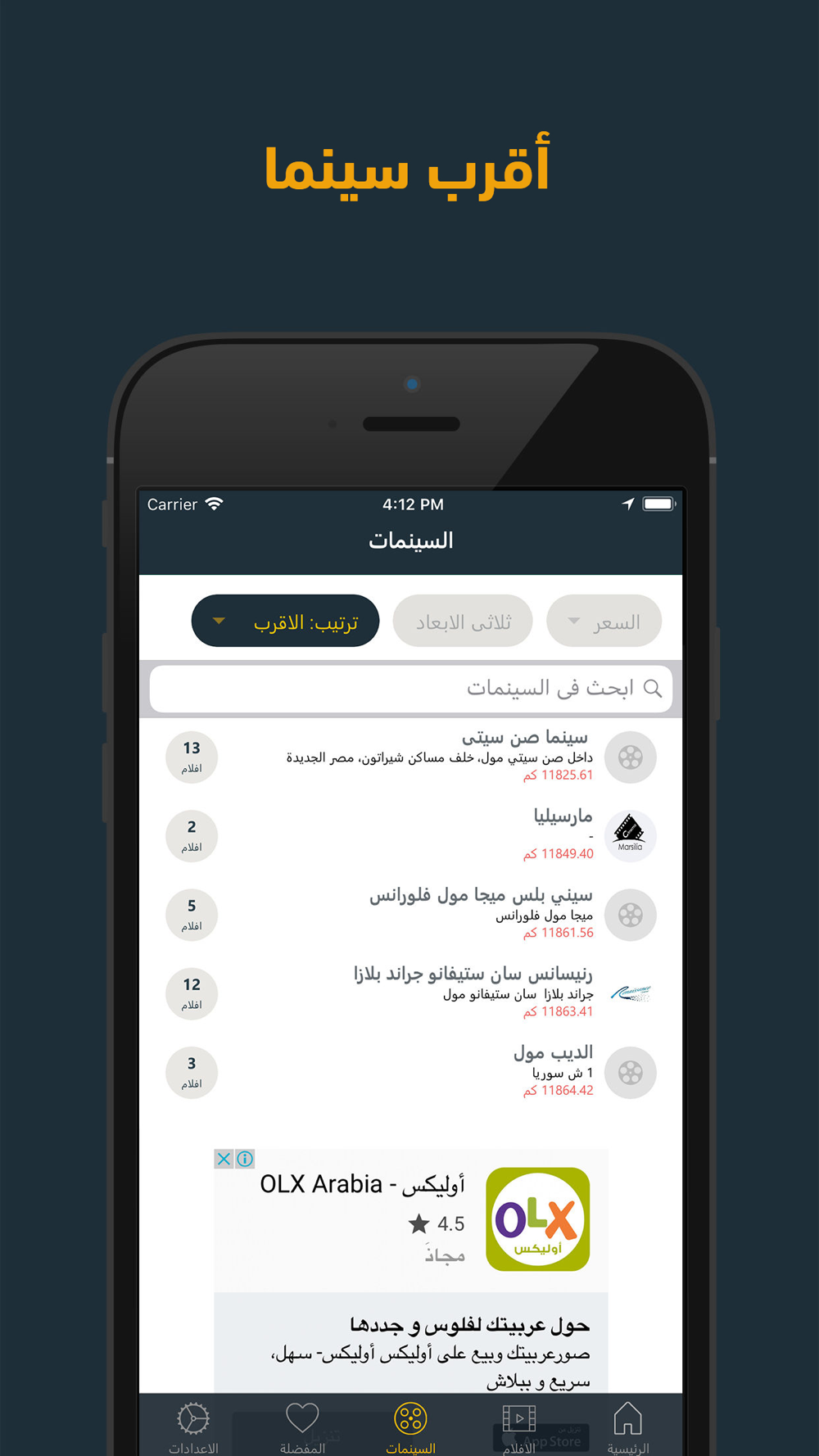 - معرفة أقرب السينمات إلى موقعك الحالي والأفلام المعروضة بها.