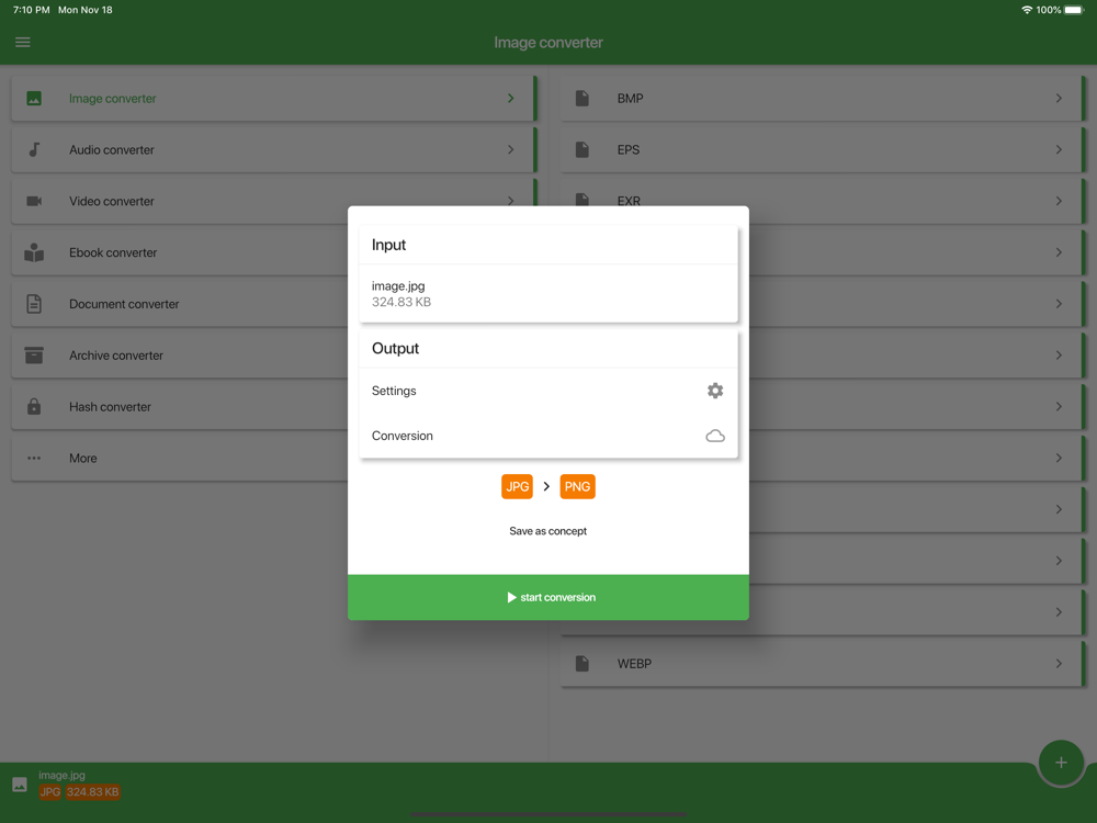 Images converter: AI, BMP, EPS, EXR, GIF, ICO, JPEG, JPG, PNG, PS, SVG, TGA, TIFF, WBMP, WEBP