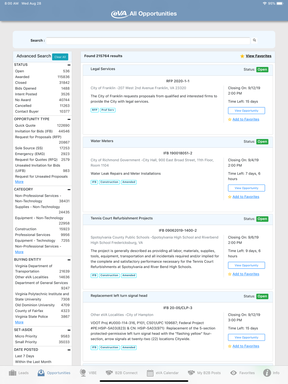 These opportunities, commonly referred to as "solicitations", are publicly posted on Virginia's innovative eProcurement system, eVA. The Virginia Business Opportunity (VBO) page is the specific part of eVA's public website where businesses can find thousands of opportunities right at their fingertips. eVA Mobile provides fast access to all of these solicitations directly through your mobile device. Easy to use and powerful, this app delivers critical information that empowers businesses to keep abreast of what the Virginia government market is looking to buy, while its integrated calendar feature helps to ensure they won’t miss out on potentially valuable opportunities.