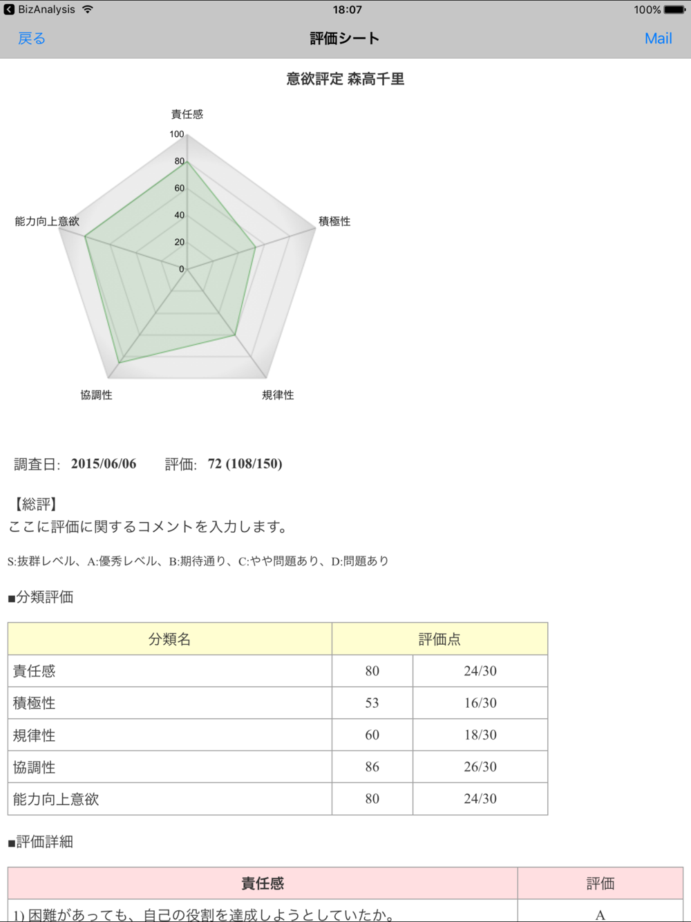 ※評価入力後、即時にレーダーチャート付きのレポートを確認できます。