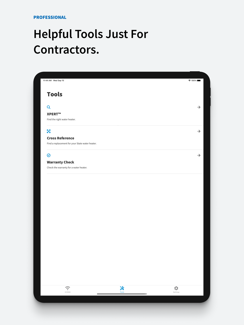 With constant remote monitoring and helpful tools designed just for professionals, the State Water Heaters Mobile App features the iCOMM™ connectivity platform, the latest technology for remote water heater management.