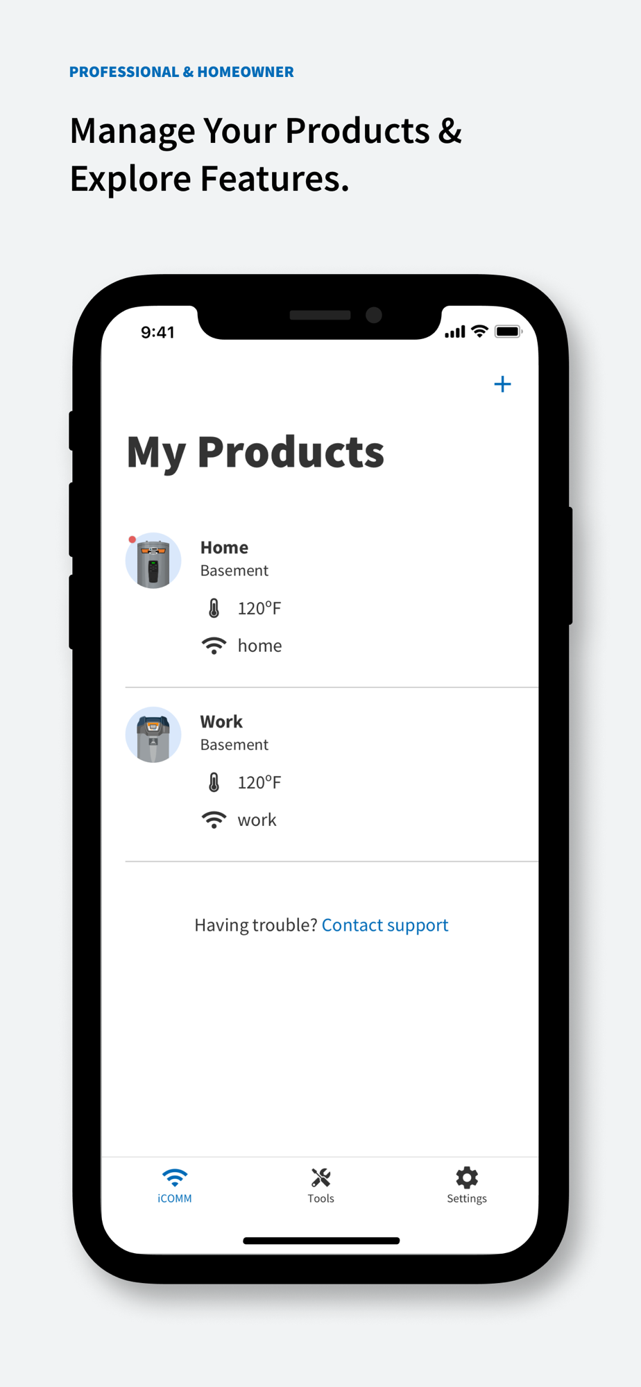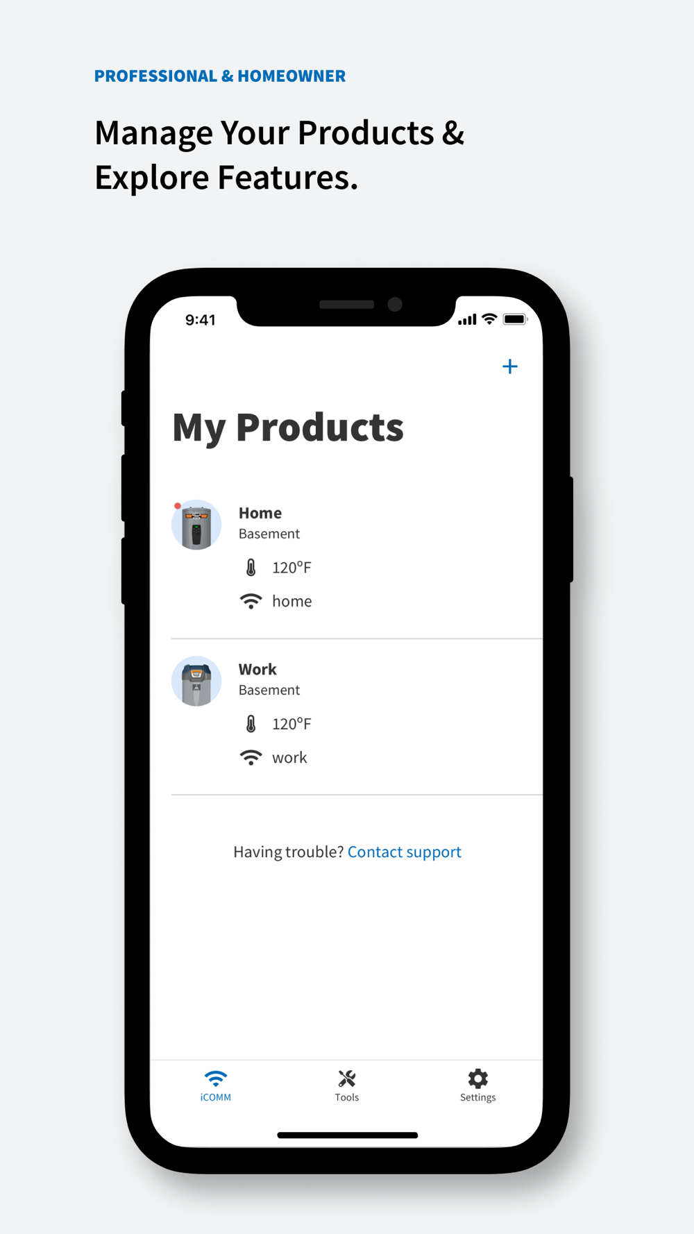 Through an easy setup process, connect all your iCOMM™ enabled water heaters to the app. Once connected, you’ll gain access to diagnostic fault notifications, settings for your water heaters and much more.
