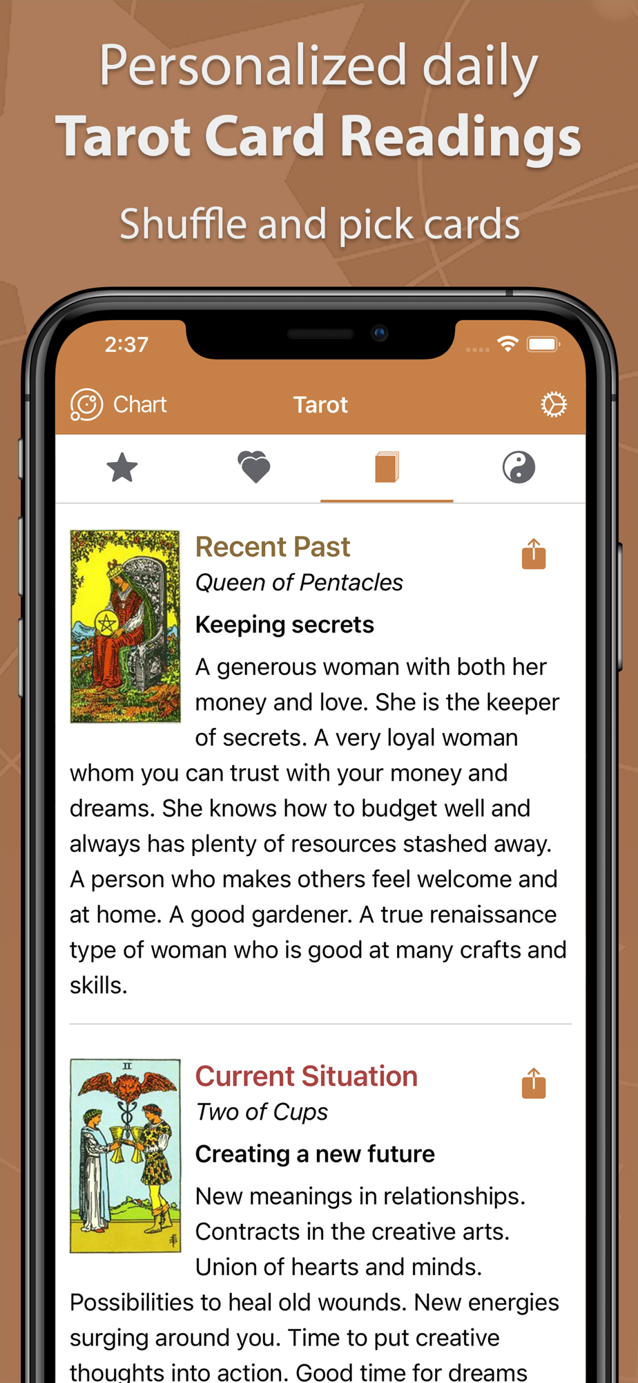 Each day you will have access to a new three-card tarot reading. Shuffle the deck and then select your own three cards, one each for the past, present and future. Tarot cards can help to explain your current situation and anticipate future events.
