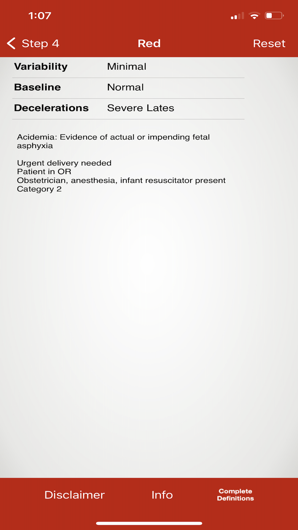 When using the FHR 5-tier app it is not necessary to refer to any other table or chart. Variability and baseline, and the shape, nadir, and duration of decelerations are entered with buttons on the consecutive screens. The app calculates the severity of the deceleration and the color for each tracing. All aspects of the tracing are summarized on the colored results screen, so that the user can quickly communicate with others.