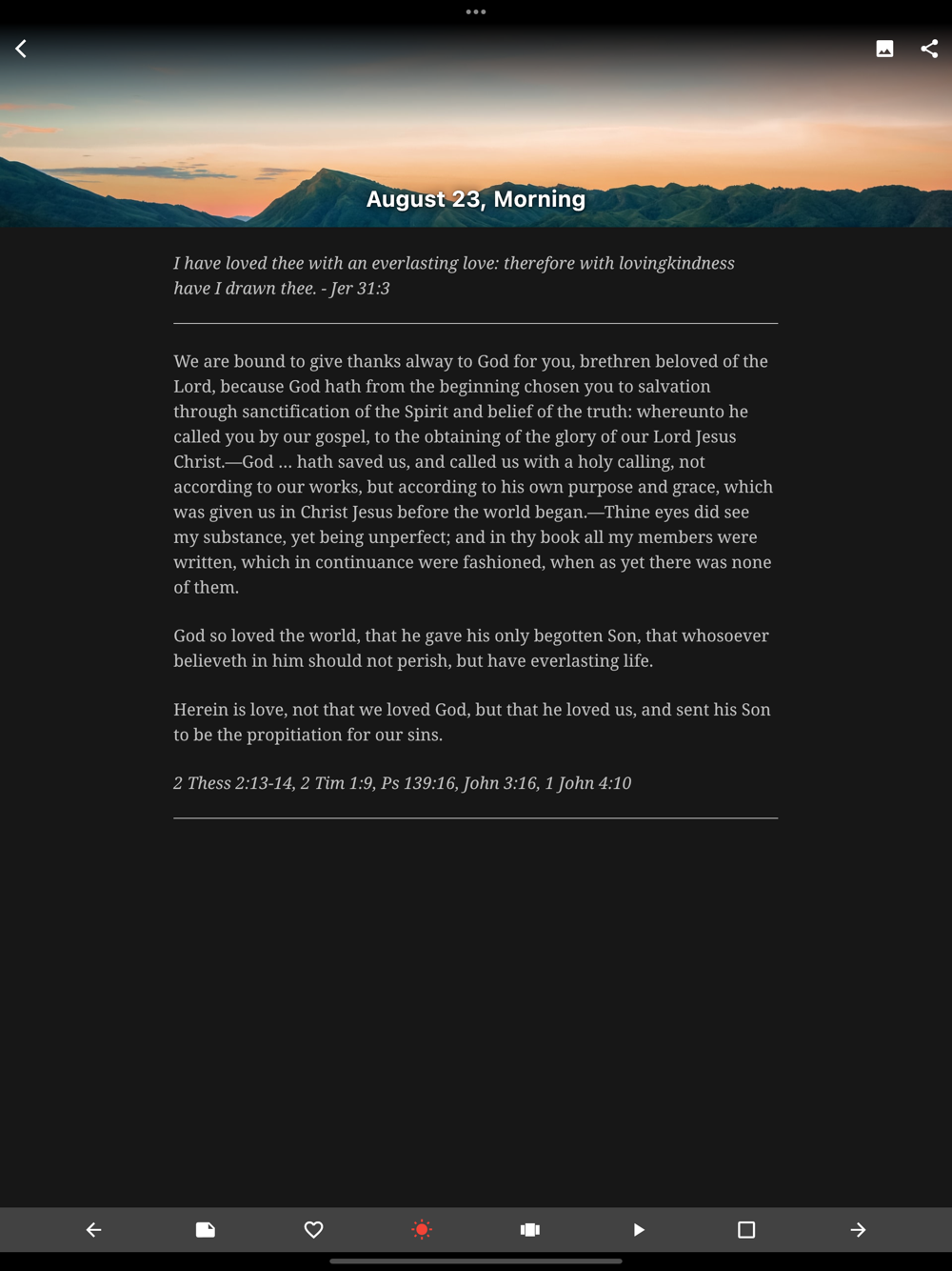 Experience God's Word daily as you read the timeless classic Daily Light on the Daily Path by Samuel Bagster updated with digital features for your iPhone or iPad.