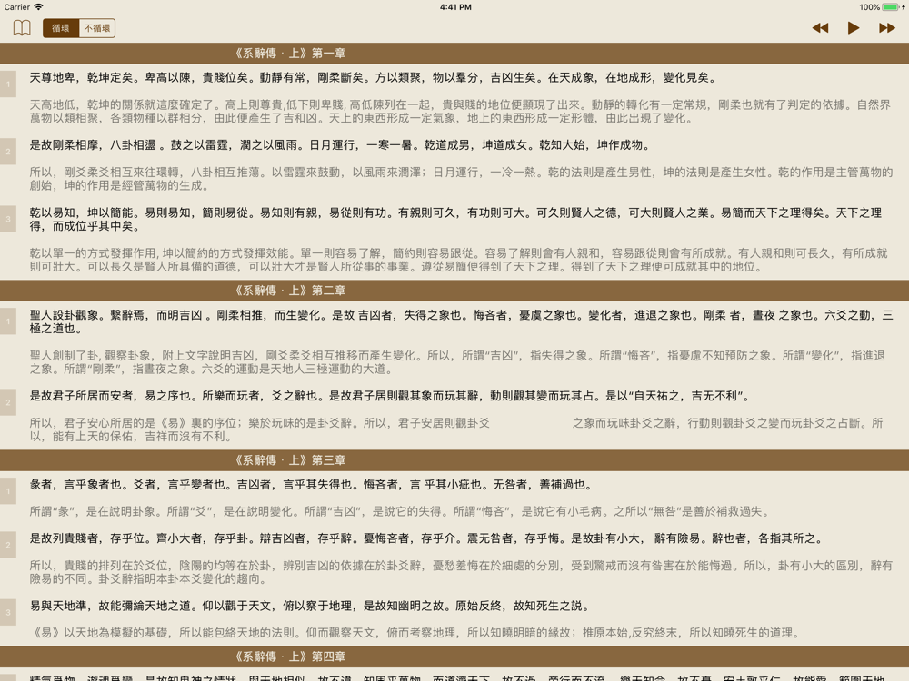 本软件的朗读及翻译功能旨在帮助学习者欣赏,理解《系辞传》从而从哲理上把握《易经》。