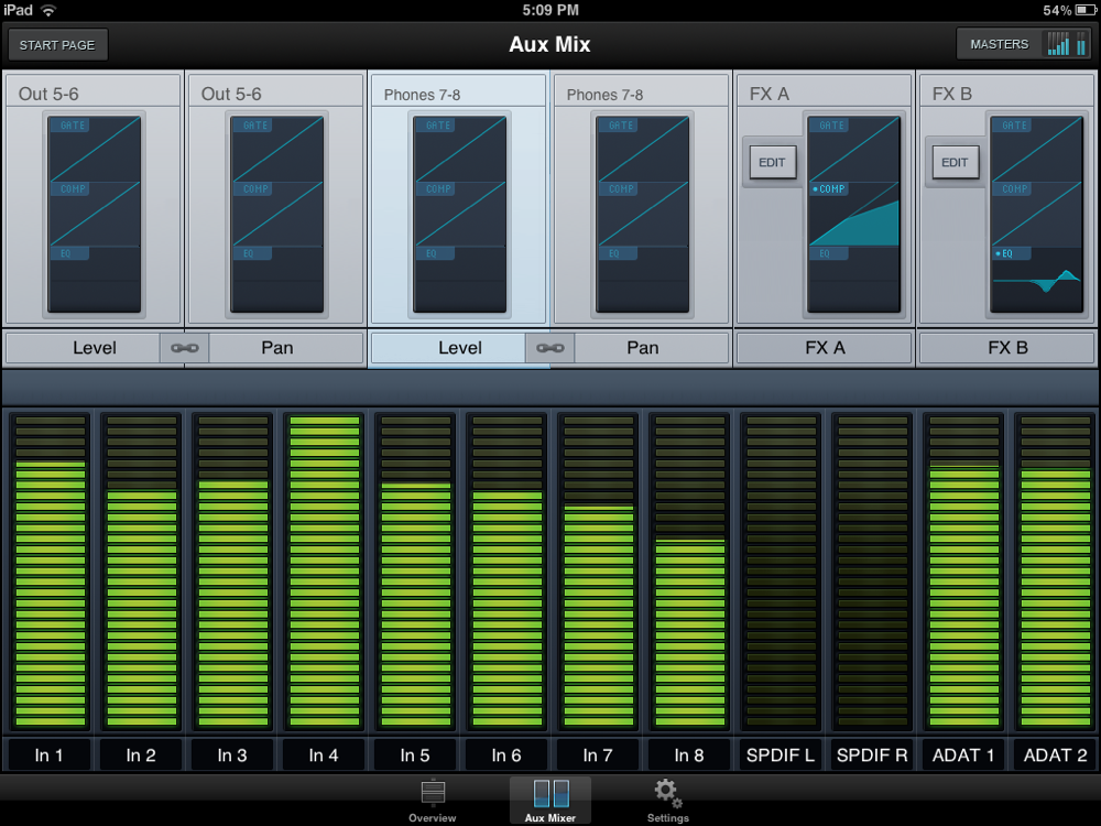 •Aux view shows the levels, panning, and Fat Channel processing for the Aux sends and internal FX buses