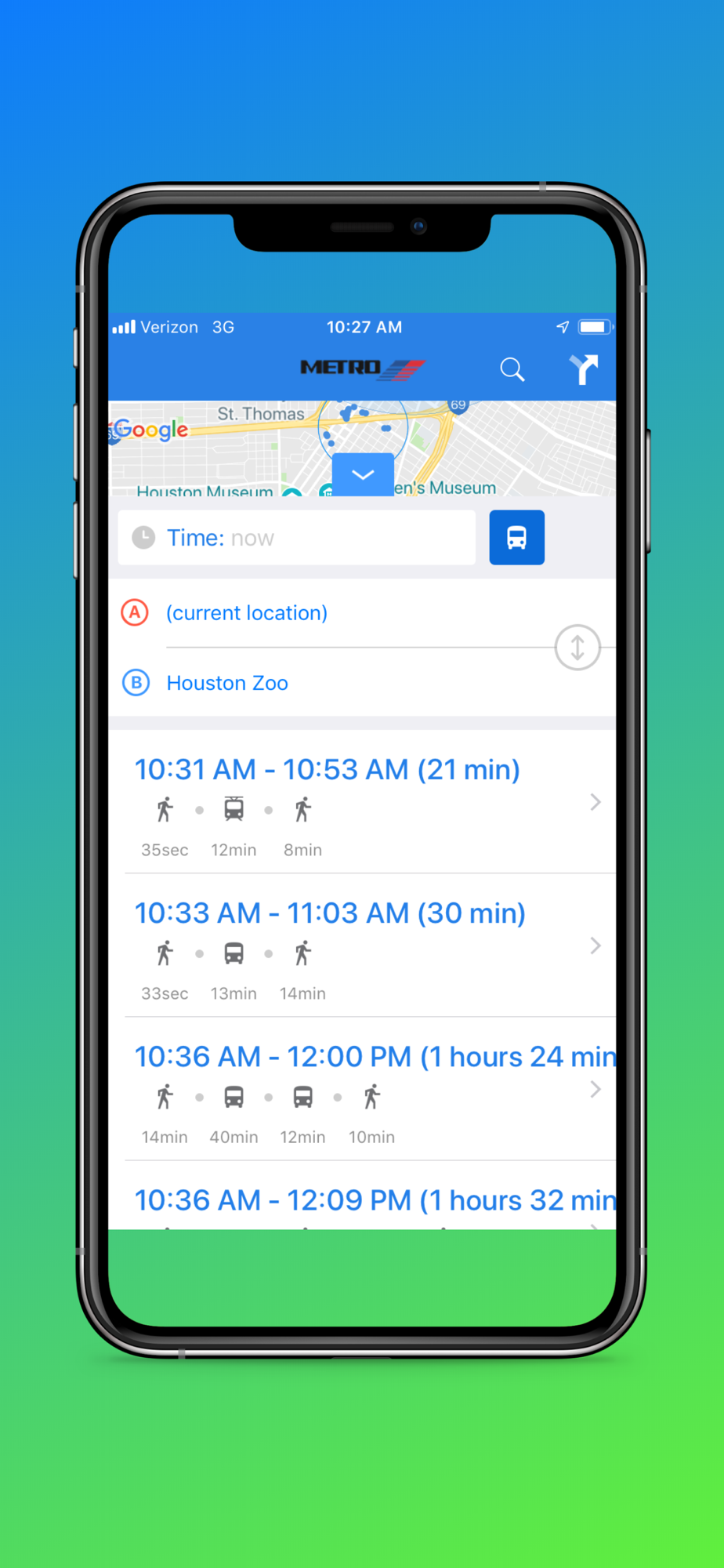 The official METRO TRIP app is a personalized navigation tool that allows you to quickly and easily manage your trip on Local bus, Park & Ride bus, METRORail or METRORapid. It requires a cellular network or wireless connection.