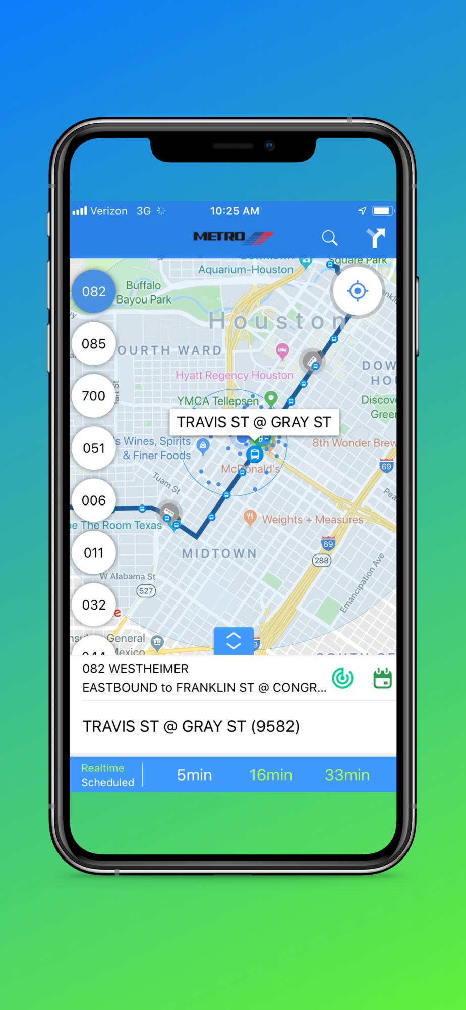 By allowing the app to access your location, an interactive map automatically detects nearby bus, rail and METRORapid routes – along with estimated arrival times.