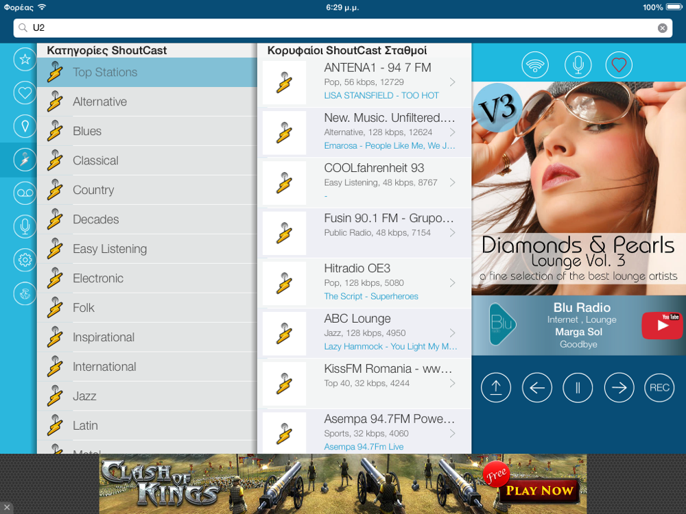 Στην πρώτη οθόνη θα δείτε τα μεγαλύτερα ραδιόφωνα της Ελλάδας και θα τα ακούσετε με ένα μόνο κλικ.
