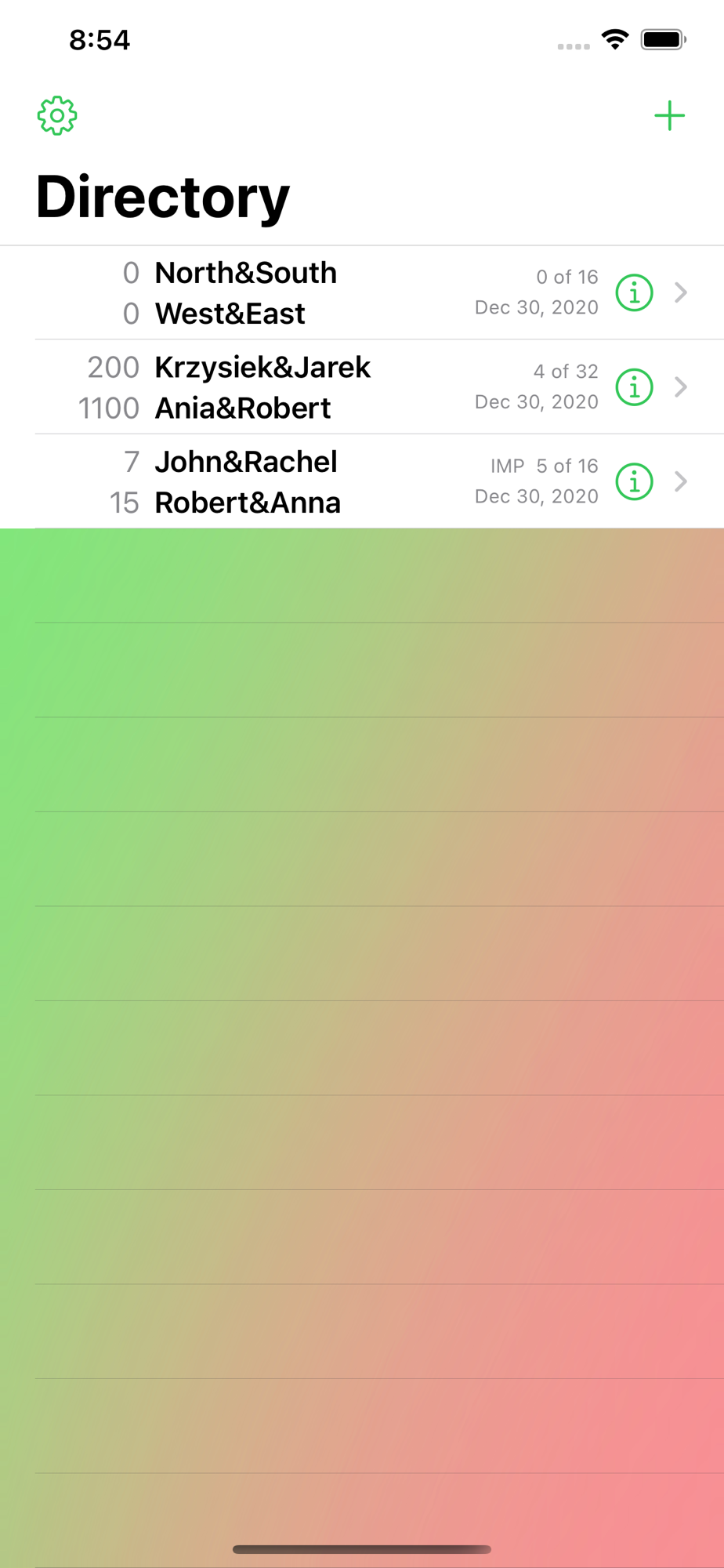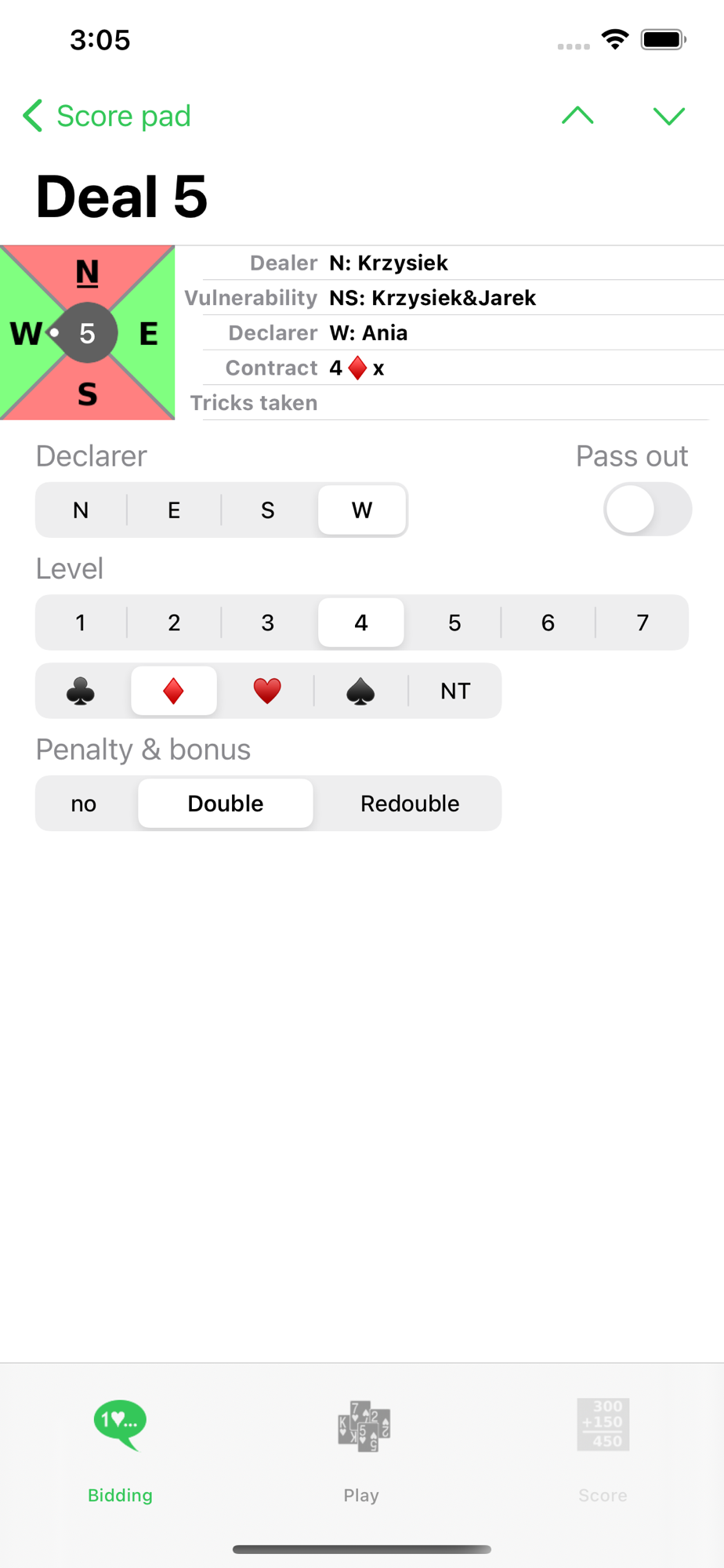 The initial screen shows the condition/contract/score pad (a ladder), while the detail screen serves for contract input and for score detail tracking. That’s it!