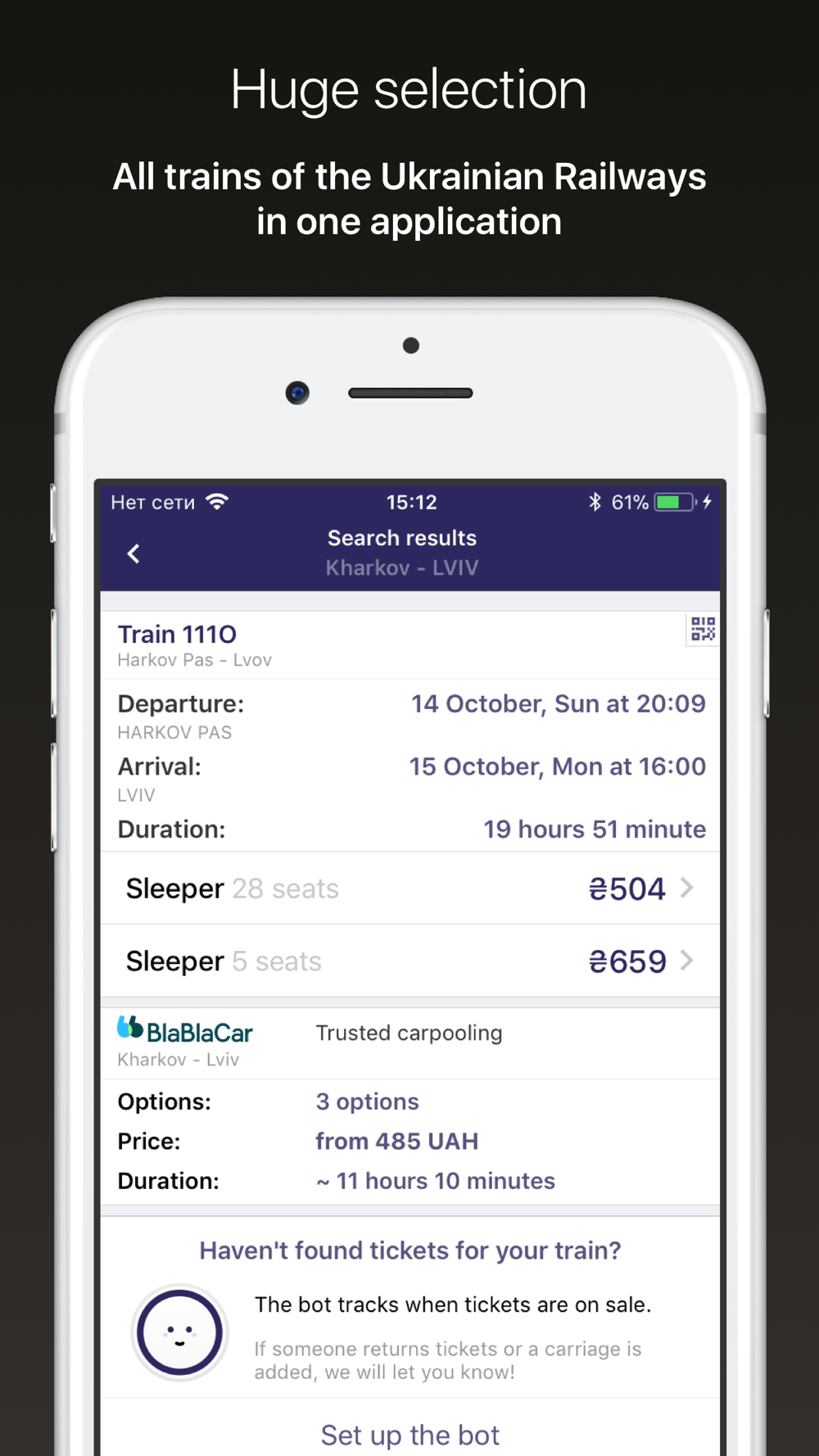 The application allows to quickly and easily purchase tickets for the trains of Ukrainian Railways (Ukrzaliznytsia). Tickets.ua is an easy-to-use service that allows you to directly work with Ukrainian Railways system and pay for the train tickets via your credit/debit card. Upon successful payment, you will receive an SMS with a unique booking reference, on presentation of which you will get a ticket at the booking office.