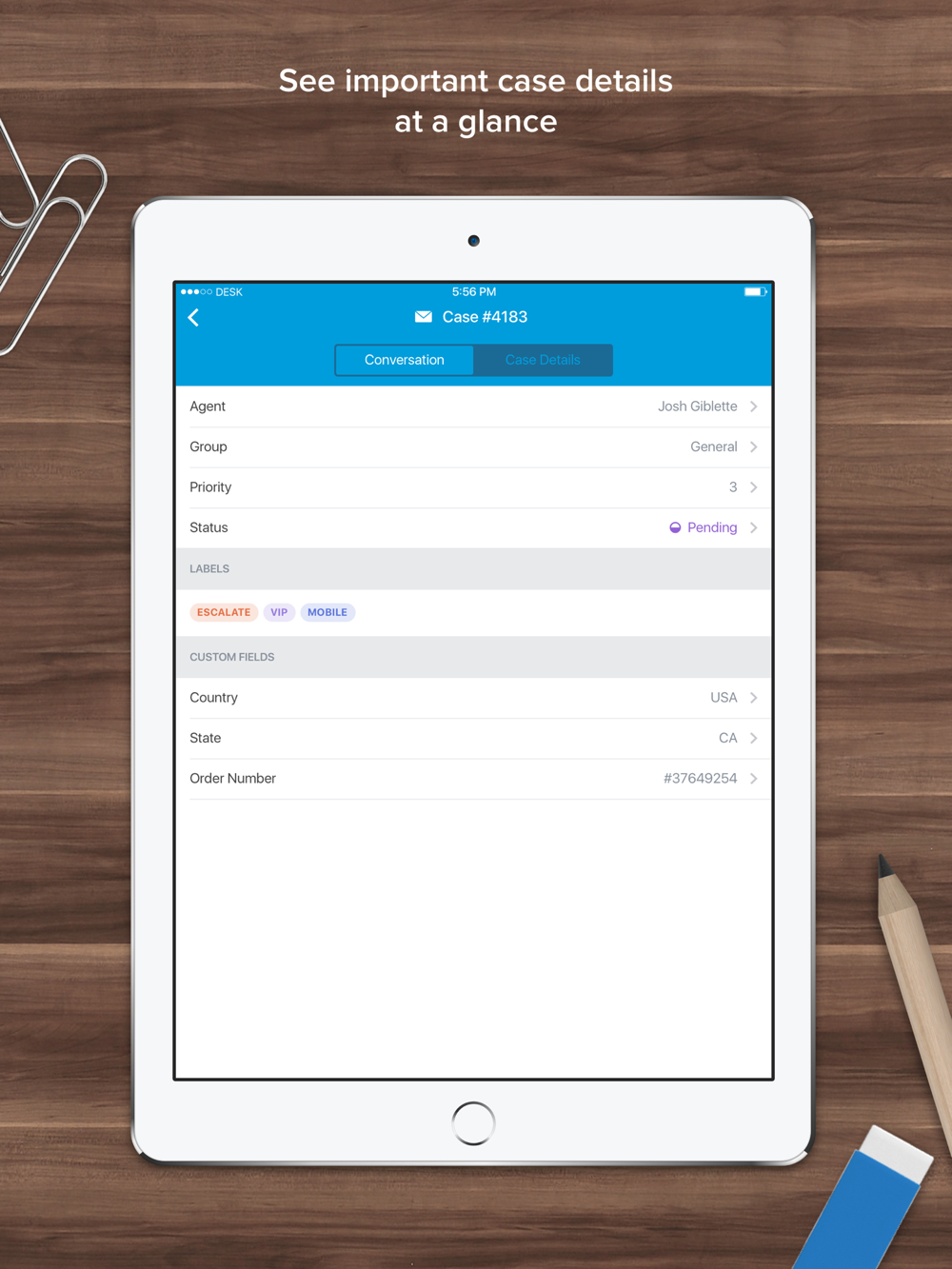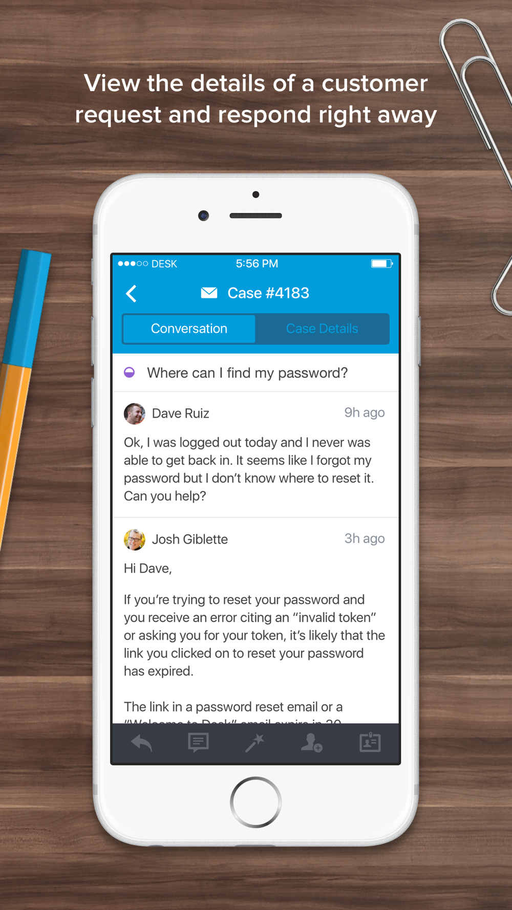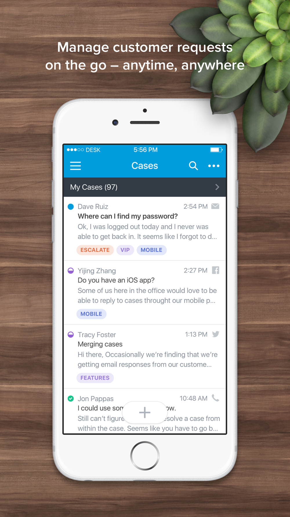 Whether you're on the road or just in the conference room, the Desk app will help you stay on top of customer issues, collaborate with your team, and track and respond to cases. It's that easy and it's always safe and secure.