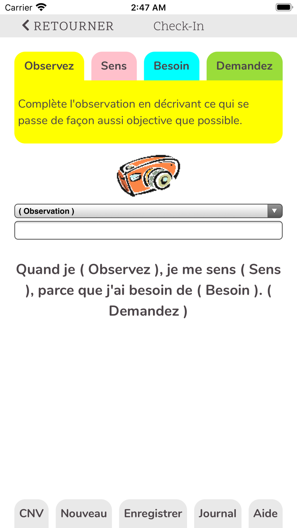 A l'aide du modèle de Communication NonViolente (CNV), des couleurs des Pistes de Danse CNV et d'images du projet Giraffentraum (Rêve Girafe), l'apps iCheck-in CNV vous fait prendre conscience pas à pas de ce que vous observez, ce que vous ressentez face à cela, quel besoin est satisfait ou non, et ce que vous pourriez faire dans cette situation.