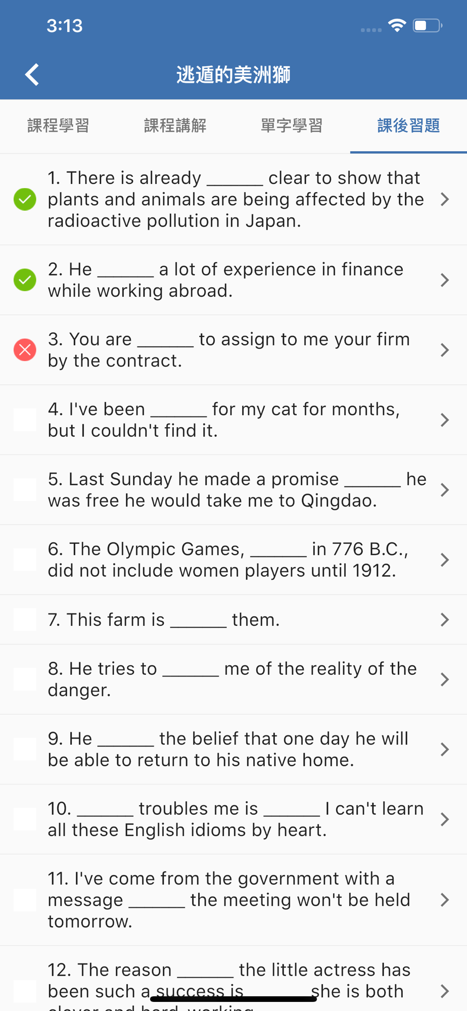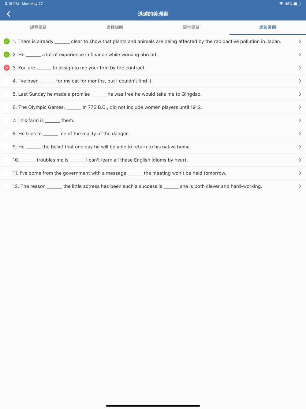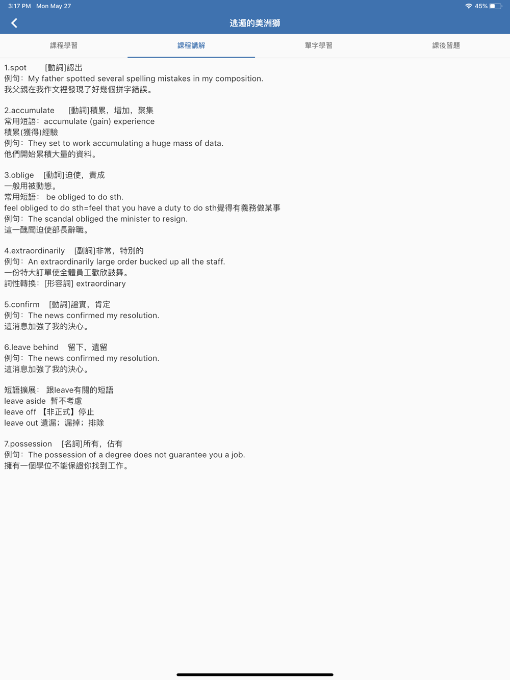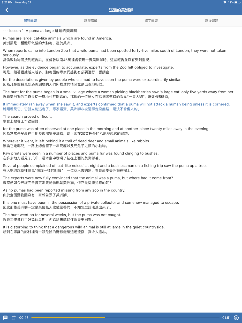提高課程:掌握英語的關鍵(Developing Skills)著重分析句子之間內在的邏輯關系, 使你認識到句型的精煉、優美、實用與可模仿性, 從而將其有機地運用於英語寫作之中;老師將進一步擴充講解詞匯、短語及語法的實戰運用。具備3000個左右的詞匯, 或已完成「從零開始學英文」第二冊學習的學員可進行「從零開始學英文」第三冊的學習。