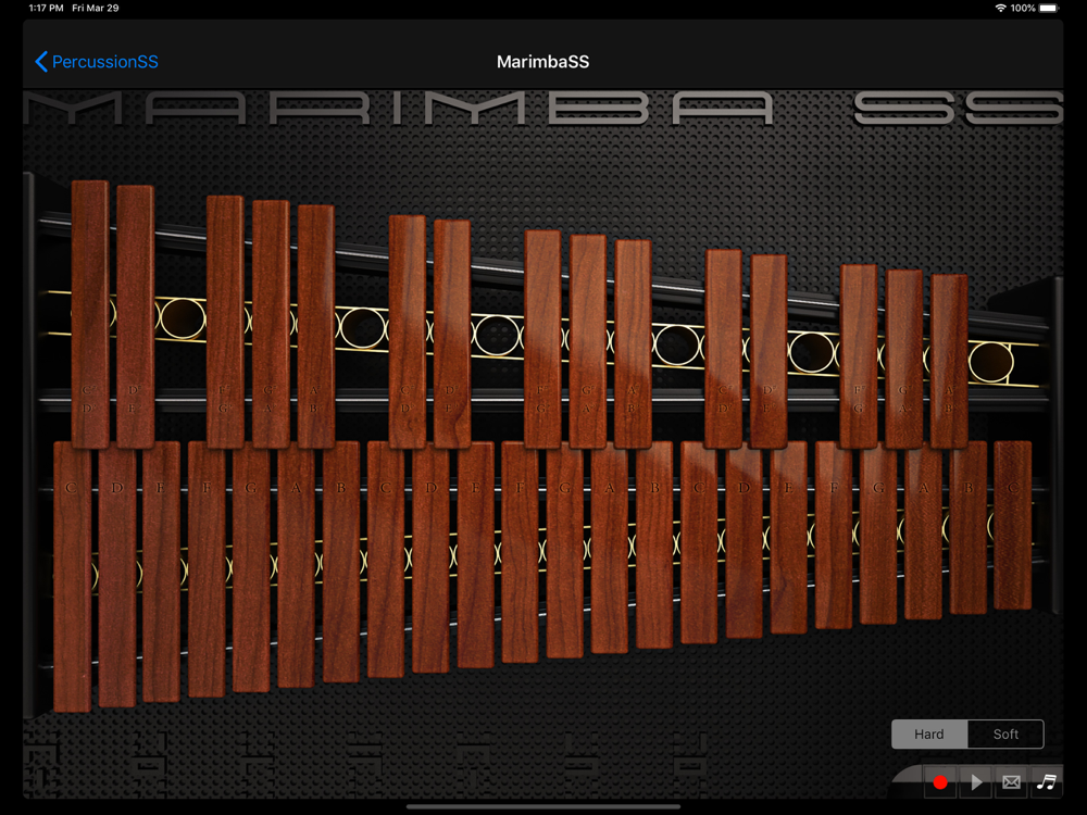 Range: C40 - C76 3 octaves (37 keys) Tone: Hard/Soft (2 types/Toggle) - iPad
