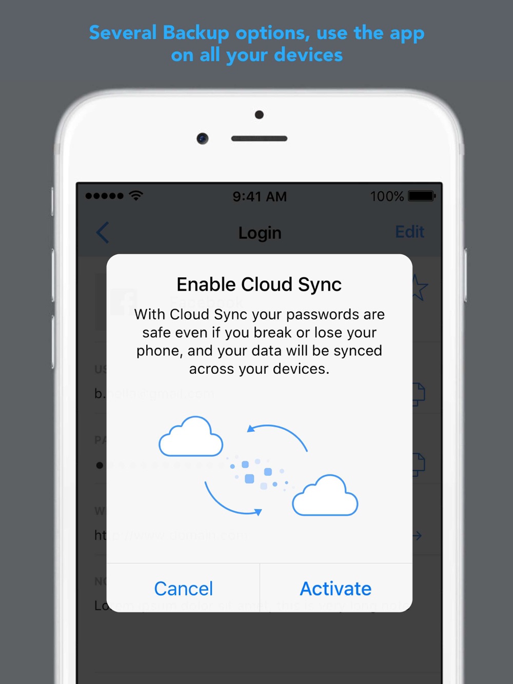 √ Don't worry if you have lost your phone or your dropbox account has been compromised, no one will ever understand your account data without your master passcode.