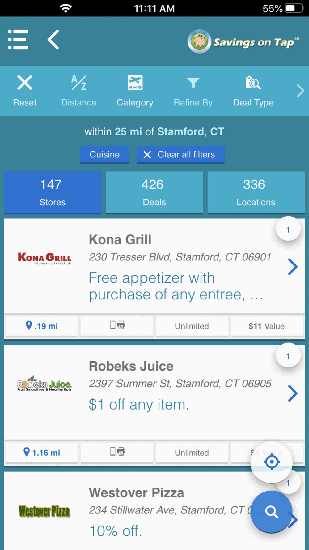 Savings on Tap members can now enjoy discounts and savings through the convenience of a mobile app! Whether you’re close to home or on the road, simply search for participating brands and locations on your mobile device and show the coupon at checkout to redeem the offer. It’s just that easy!
