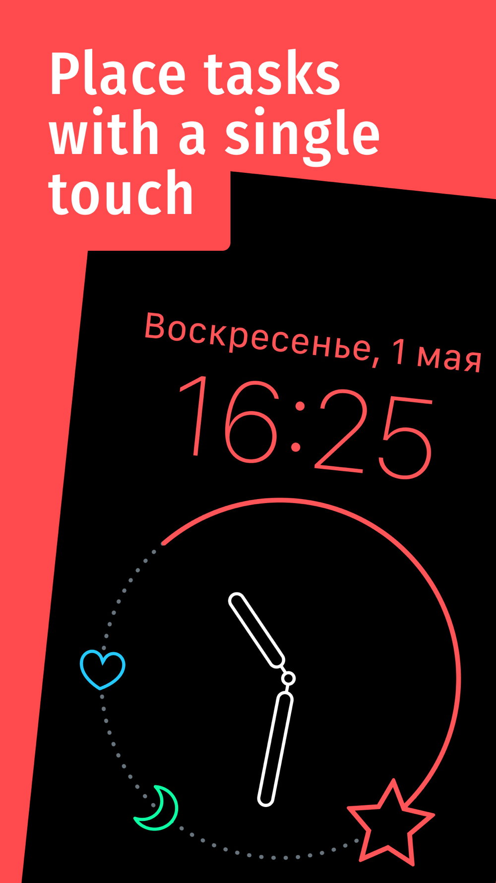Your day is set up like a clock, and your tasks are unique icons on the dial. One glance is enough to understand what to do and when to do it. "When" makes task management visual and tangible. To create a new task, touch the dial of the clock. To delete a task, drag the icon outside the dial. To change the reminder time to 10 minutes, an hour, or a few days, just change the position of the icon.