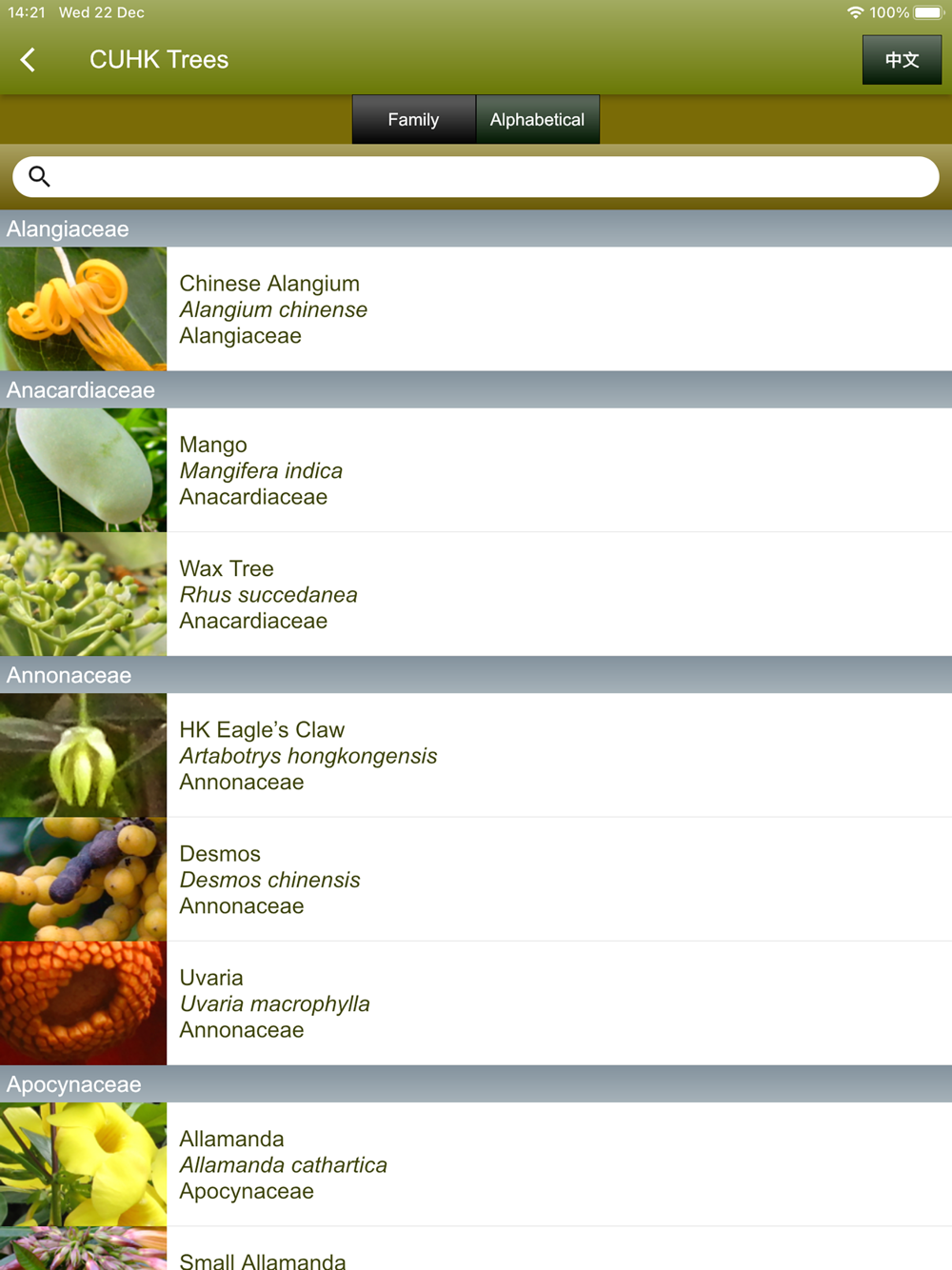 CU Trees 2.0 is a joint production of Grateful Green Group and IdeasLab. This new version is a collection of 219 species of plants found on the campus of The Chinese University of Hong Kong. The images were selected from over 10,000 photos. There are Chinese Mandarin and English voice over to help the users understand the species described. These plants are easily found in urban parks and country parks of Hong Kong. The app is a useful reference that can help users to appreciate the biodiversity of flora in Hong Kong, understand their ecology and habits, to care about and protect them. Free of charge and without commercials, once downloaded, CU Trees can be used offline.