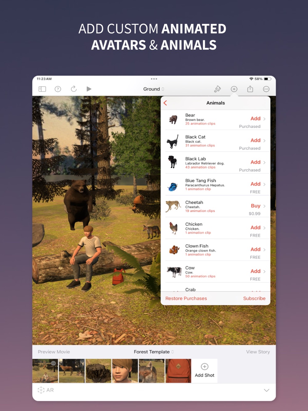 Customize your scene by adding and animating any of the hundreds of free and premium photorealistic 3D models. Action sequences are easy to build using built-in clips. Add voice clips, sound effects, background sounds and musical soundtracks.