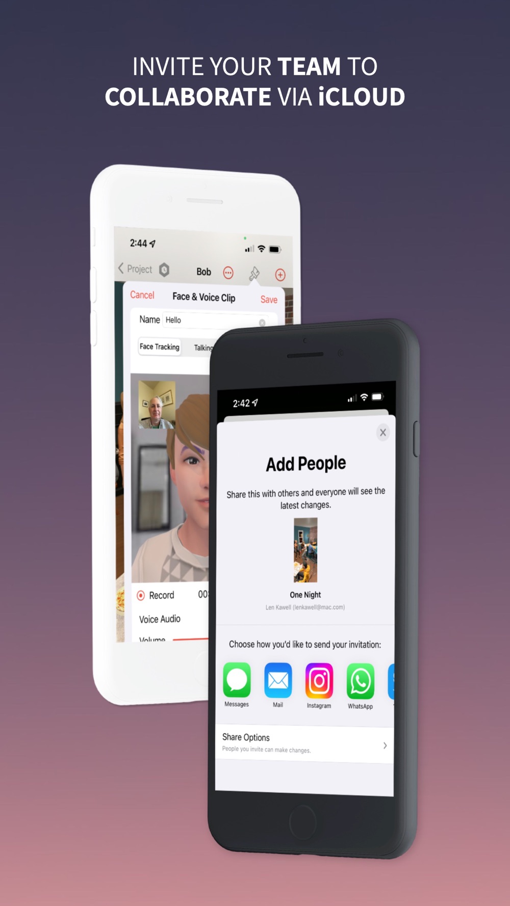 Invite your team to collaborate with you on your movies and videos via iCloud. Everyone can design and customize scenes by animating 3D models, creating and adding their own avatars, recording dialog and shooting video scenes.