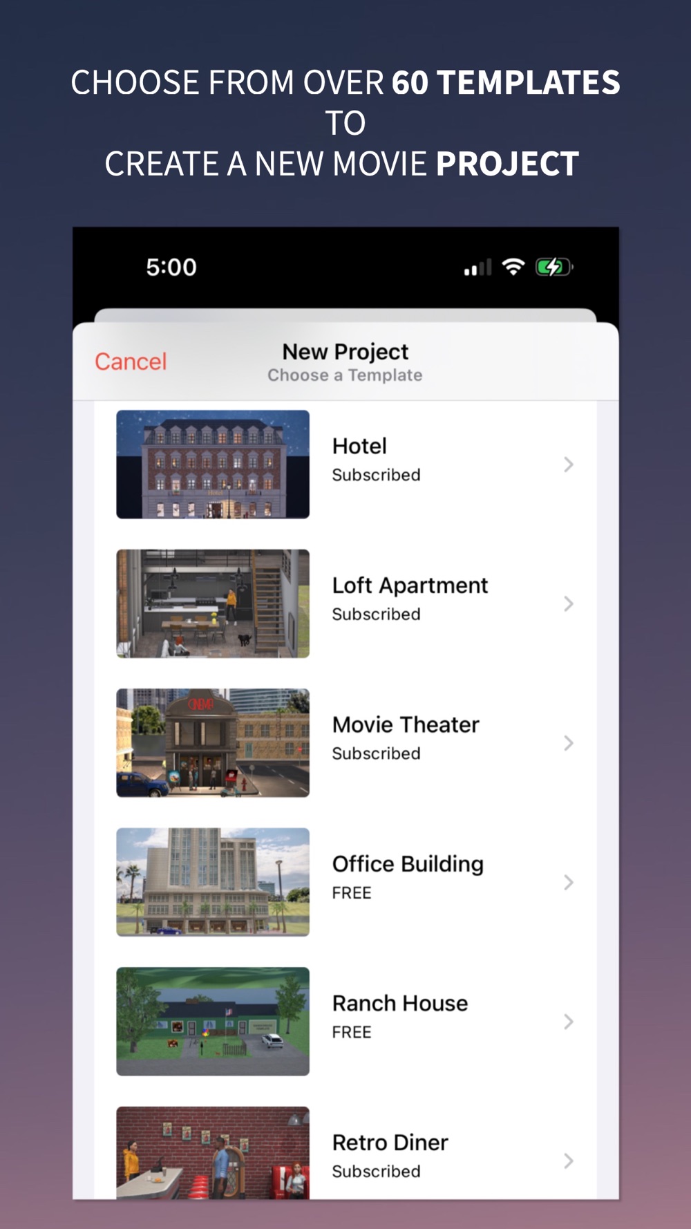 Begin creating the project of your imagination by choosing one of the dozens of templates. Most templates include scene designs, animated 3D models and built-in avatars but one is blank if you want to start there.
