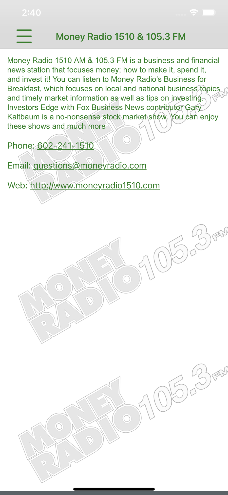 Money Radio 1510 AM & 105.3 FM is a business and financial news station that focuses money; how to make it, spend it, and invest it! You can listen to Money Radio's Business for Breakfast, which focuses on local and national business topics and timely market information as well as tips on investing. Investors Edge with Fox Business News contributor Gary Kaltbaum is a no-nonsense stock market show. You can enjoy these shows and much more by just downloading the app now.