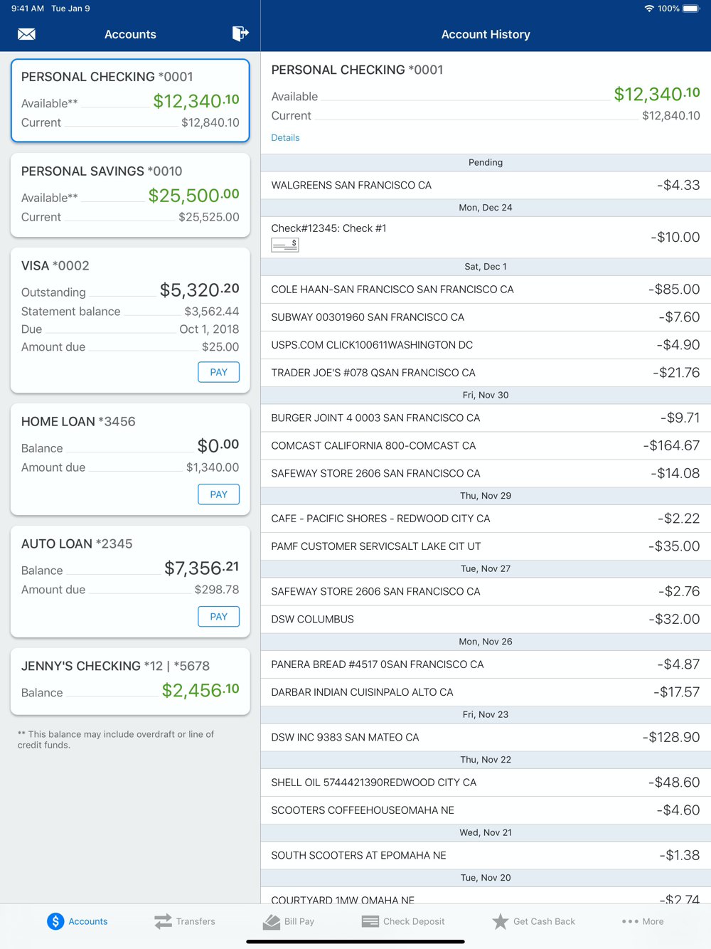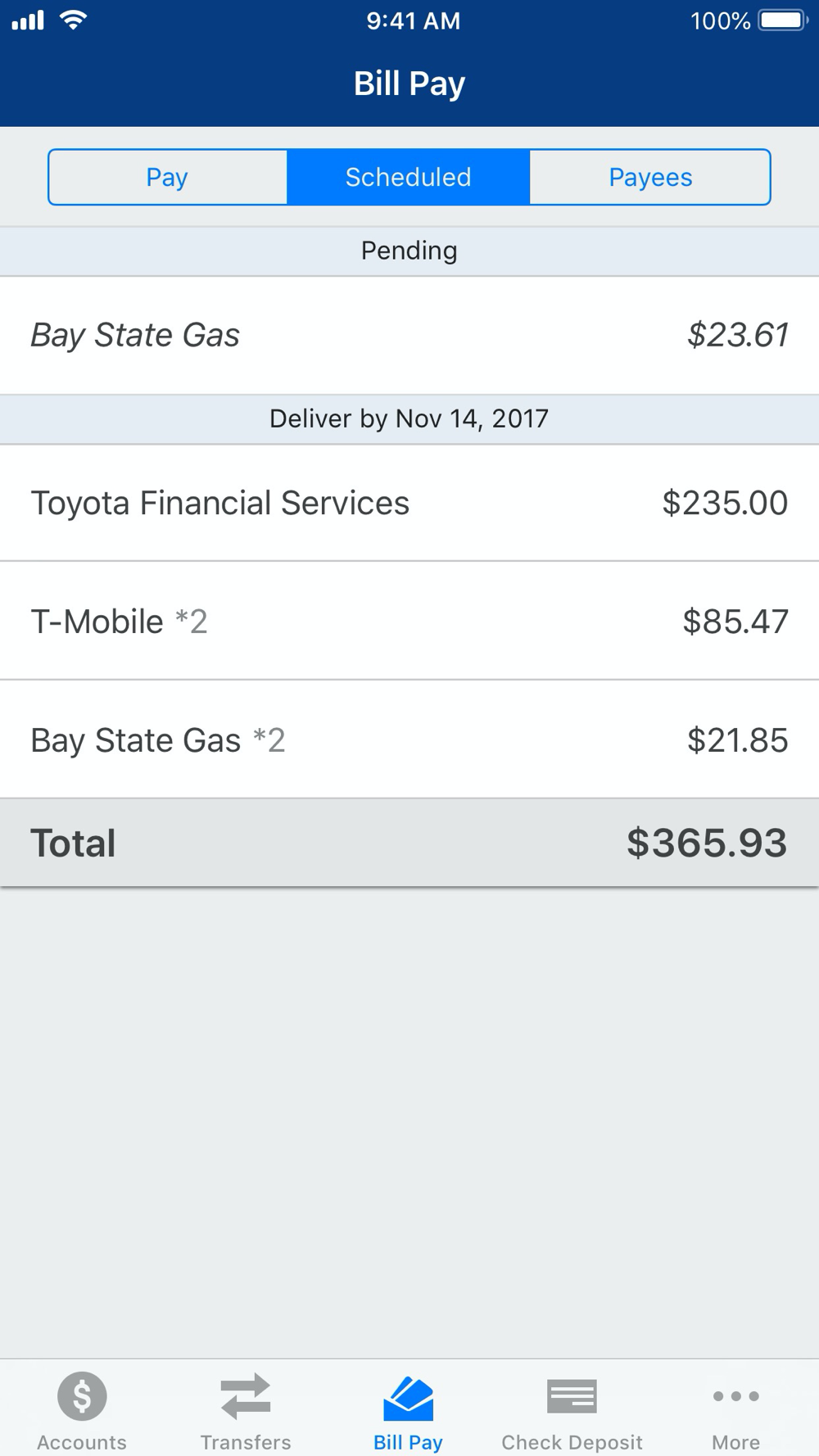 •Bill Pay – schedule bill payments, view pending payments, and edit payees