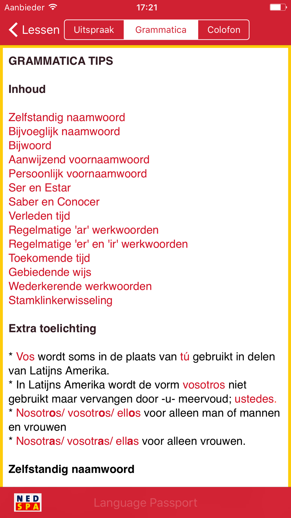 Werkwoorden: De werkwoordstructuur van het Spaans is niet heel eenvoudig. Op de Language Passport vind je een beknopte samenvatting van het Spaanse werkwoordsysteem (regelmatige “ar”, “er” en “ir” werkwoorden) en een aantal belangrijke en veel gebruikte onregelmatige werkwoorden, zoals; ser/estar (zijn), tener (hebben), ir (gaan) , hacer (doen/maken), querer (willen) etc.