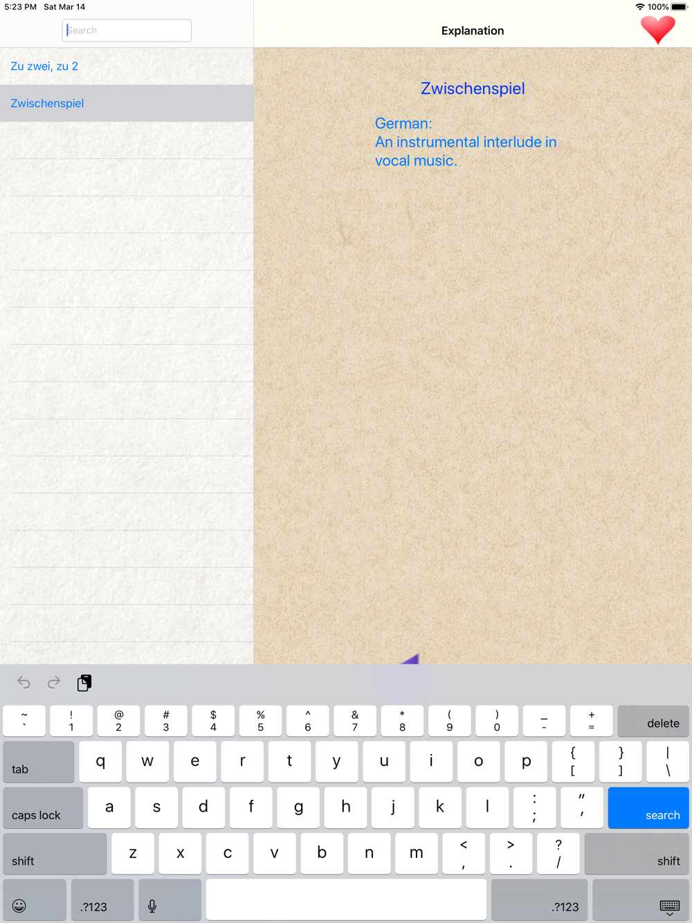 Musical Terms with Quiz is a music dictionary with audio pronunciation. It contain over 1100 terms regarding music notation, musical forms, musical expressions and directions. All the foreign terms, Italian, French and German contain audio pronunciation. All the audio files are included in the app, no need for internet connection.