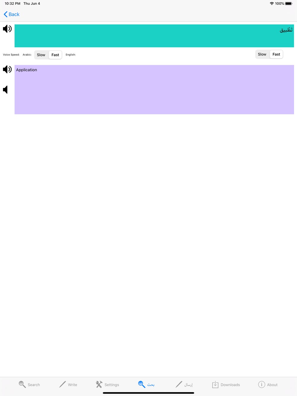 - Set the voice speed to listen words slowly or fast for both English and Arabic.
