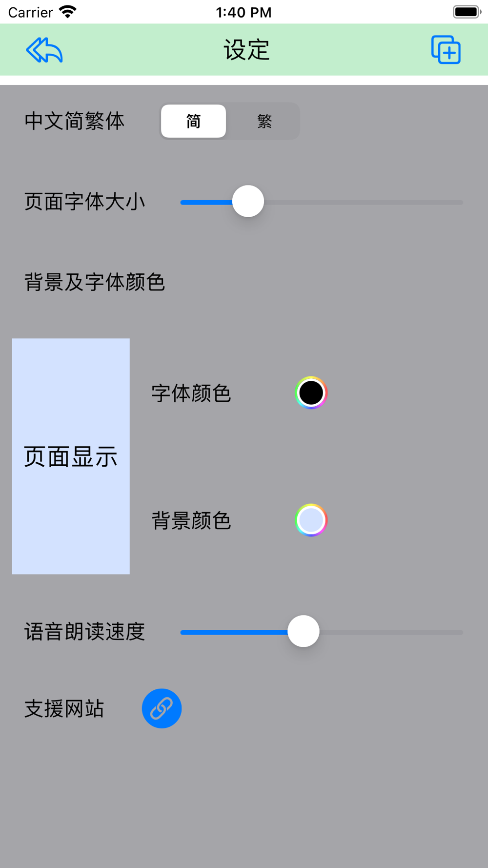 o 有设定功能提供简繁字体选项,此外,读者可以自己调整字体大小,字体颜色,和页面背景颜色。