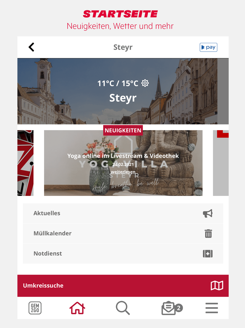 Egal wo du gerade bist – GEM2GO liefert dir stets alle Neuigkeiten über deine Gemeinde. GEM2GO ist die Gemeinde Info und Service App für alle Gemeinden Österreichs. Du findest damit also auch viele Infos und Neuigkeiten über deine Nachbargemeinden und mehr!