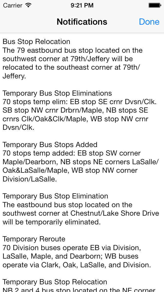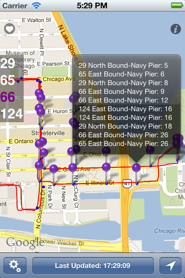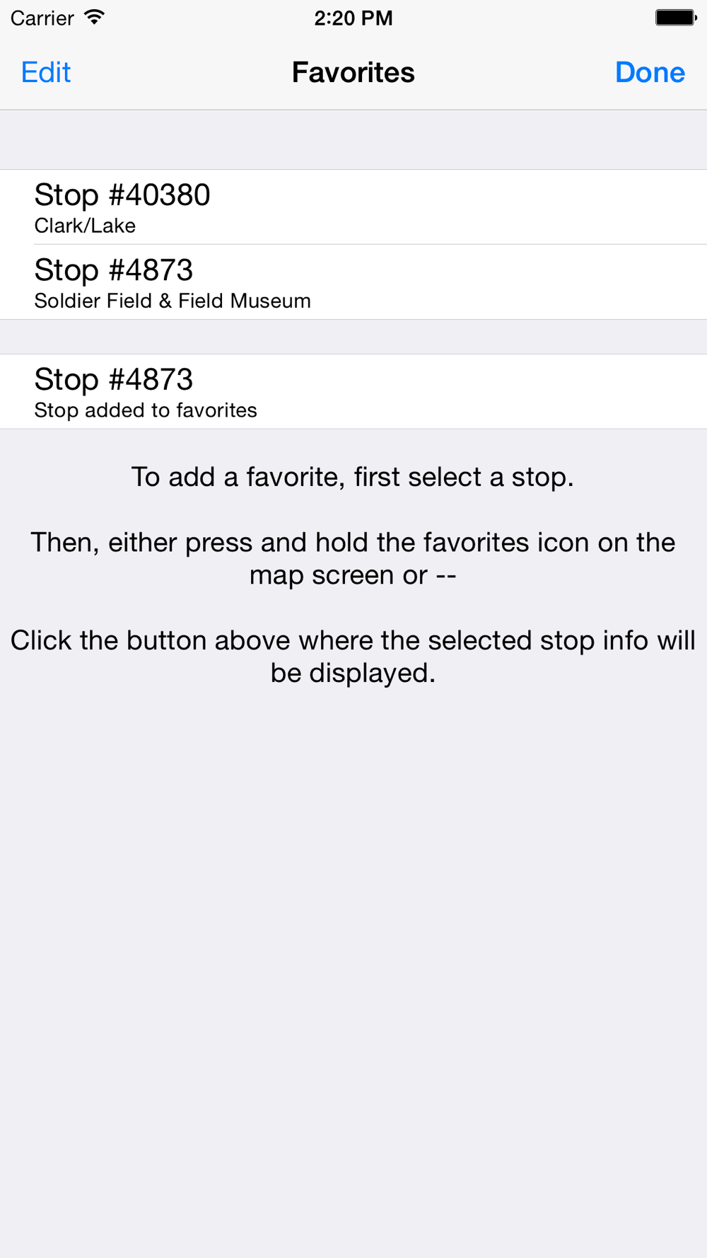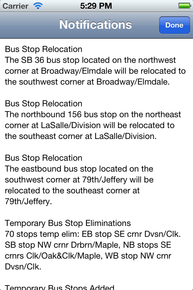 A simple, but straightforward, location based application that identifies Chicago bus stops and train stations with arrival information. Location can be determined by location services, or by your own map navigation. Display routes, save favorite stops, and view system-wide CTA notifications.