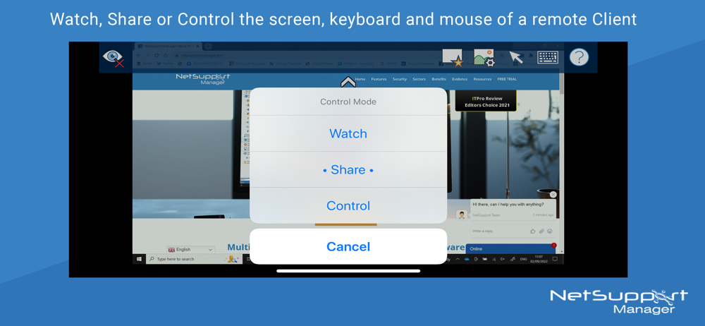 Remote Control – Watch (view only), Share (both parties can view and interact) or Control (remote screen and keyboard are locked) any NetSupport Manager-enabled remote PC.