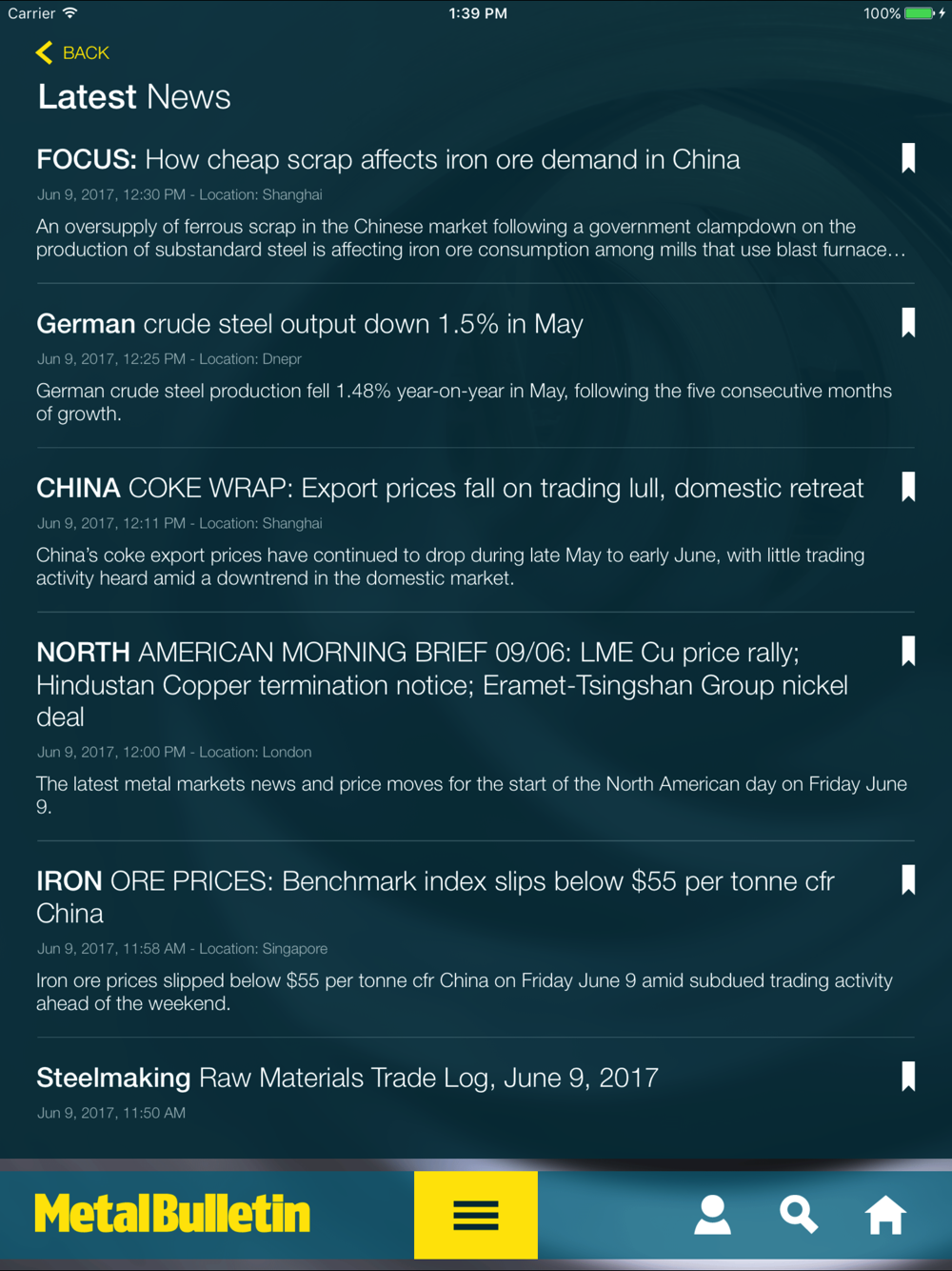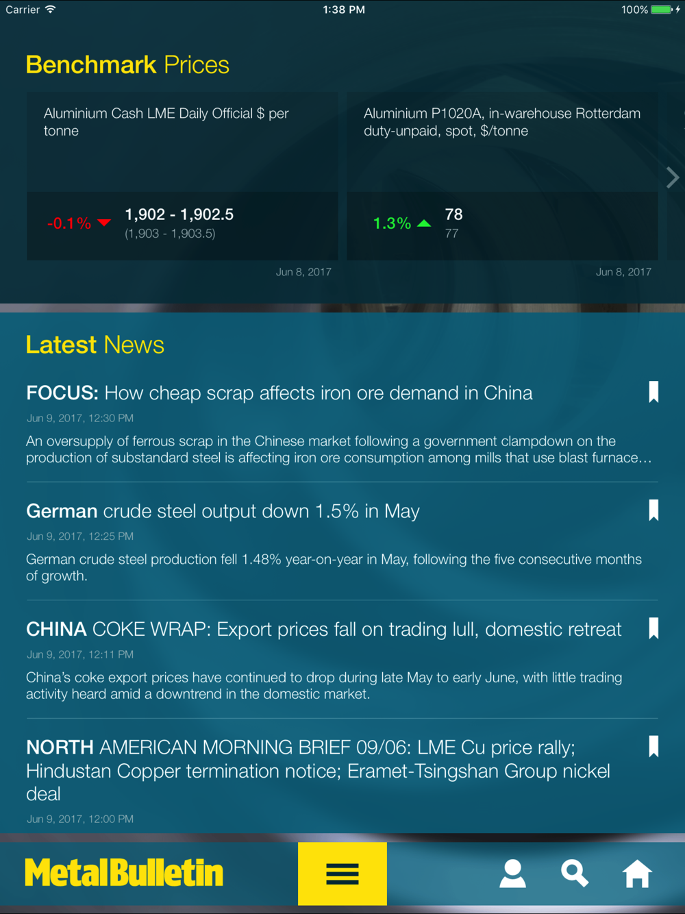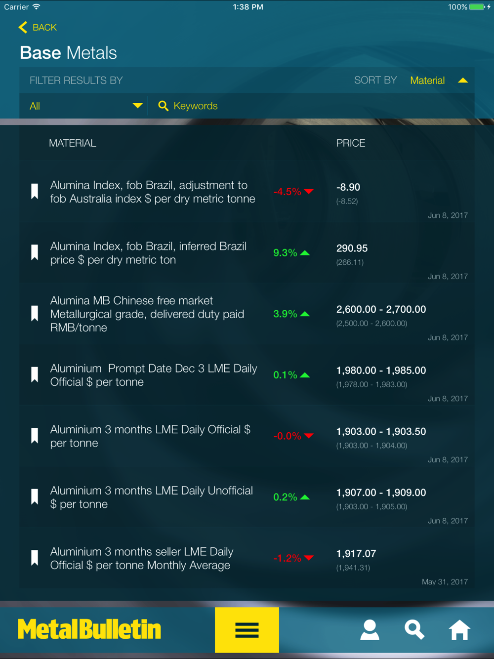 The Metal Bulletin app for iPad and iPhone gives you access to the latest global metal news, analysis and over 950 metal prices.