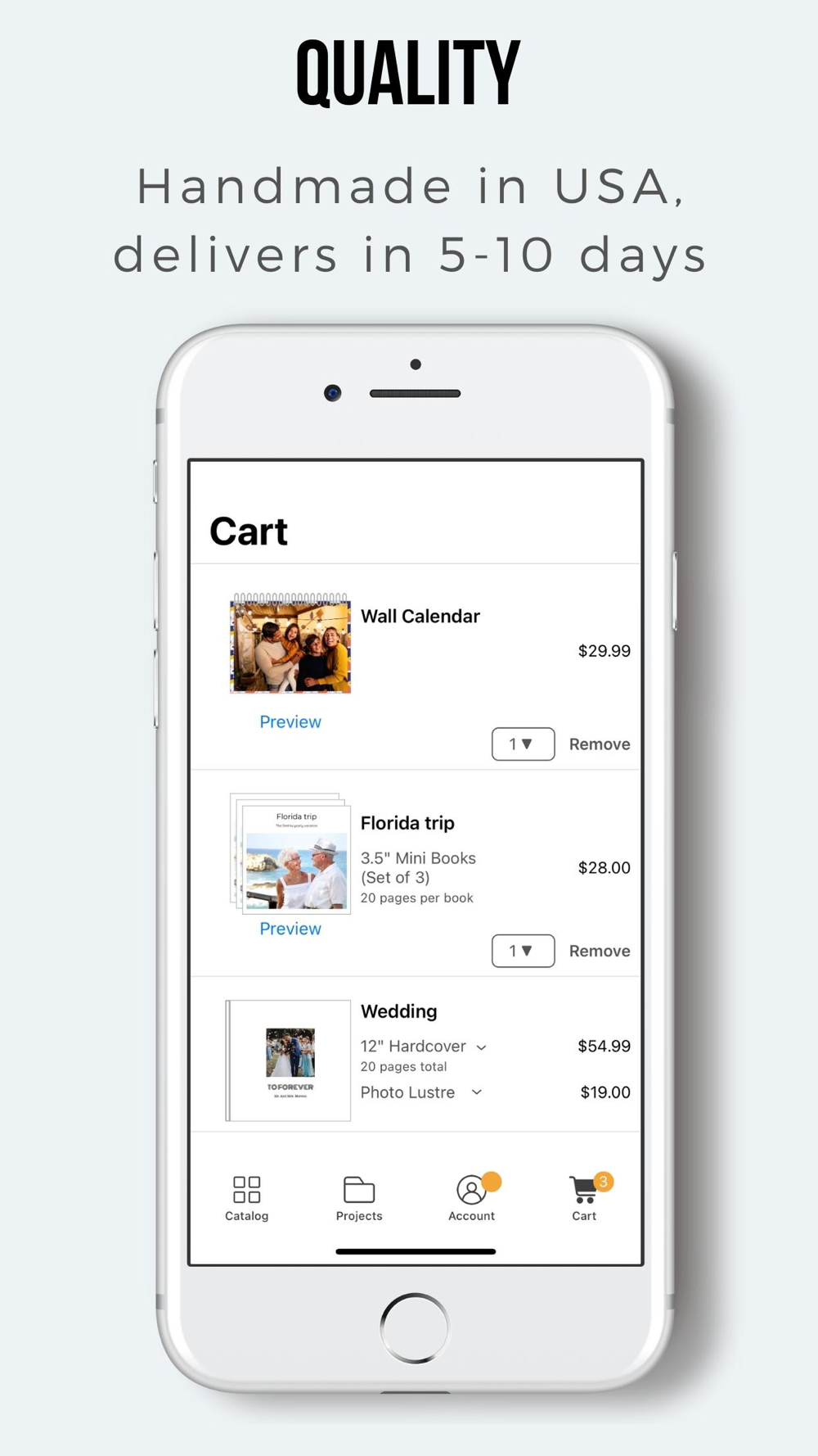 - Download our app, create a free account, select between our photo books, wall prints, or other photo products you want from the catalog, import your photos, make any customizations you desire, and submit your order.