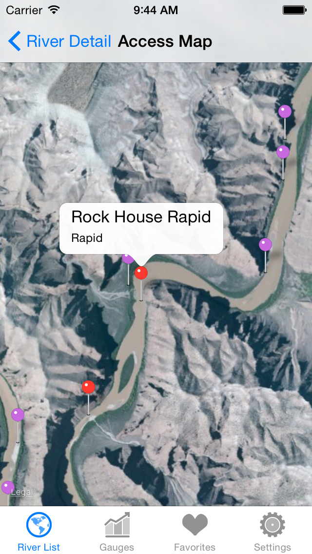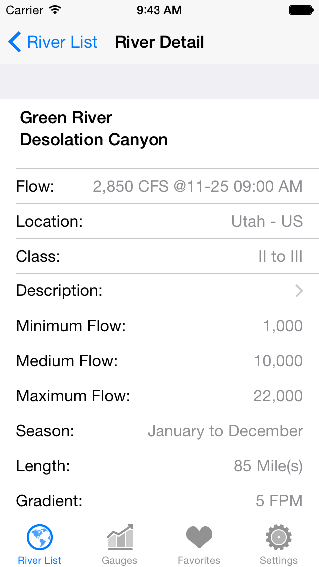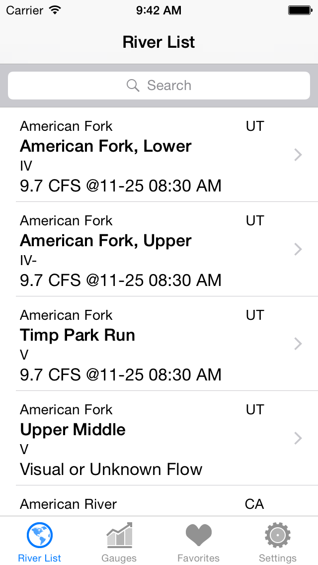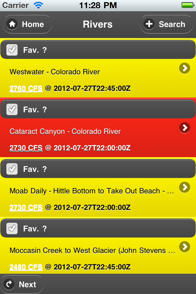 This app will list river flows and river information for a variety of rivers. This kind of application is mainly useful for recreational river users such as rafters, kayakers and anglers. Other information like access points, rapids and camps can be viewed. Registered users can also select favorite river runs to get a quick glance at river flows they are interested in.