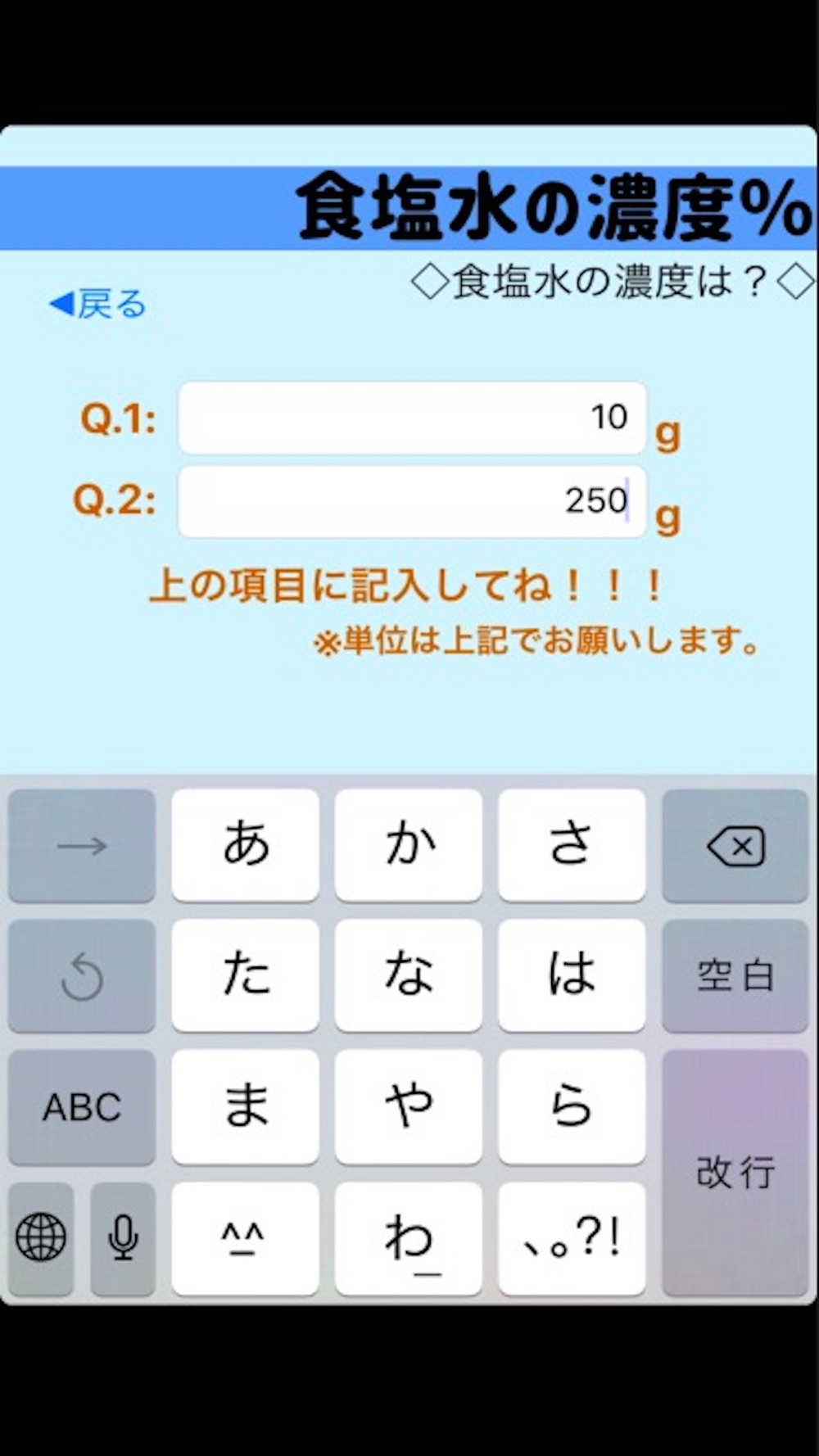 「食塩の質量」と 「水の重さ」をアプリの数字