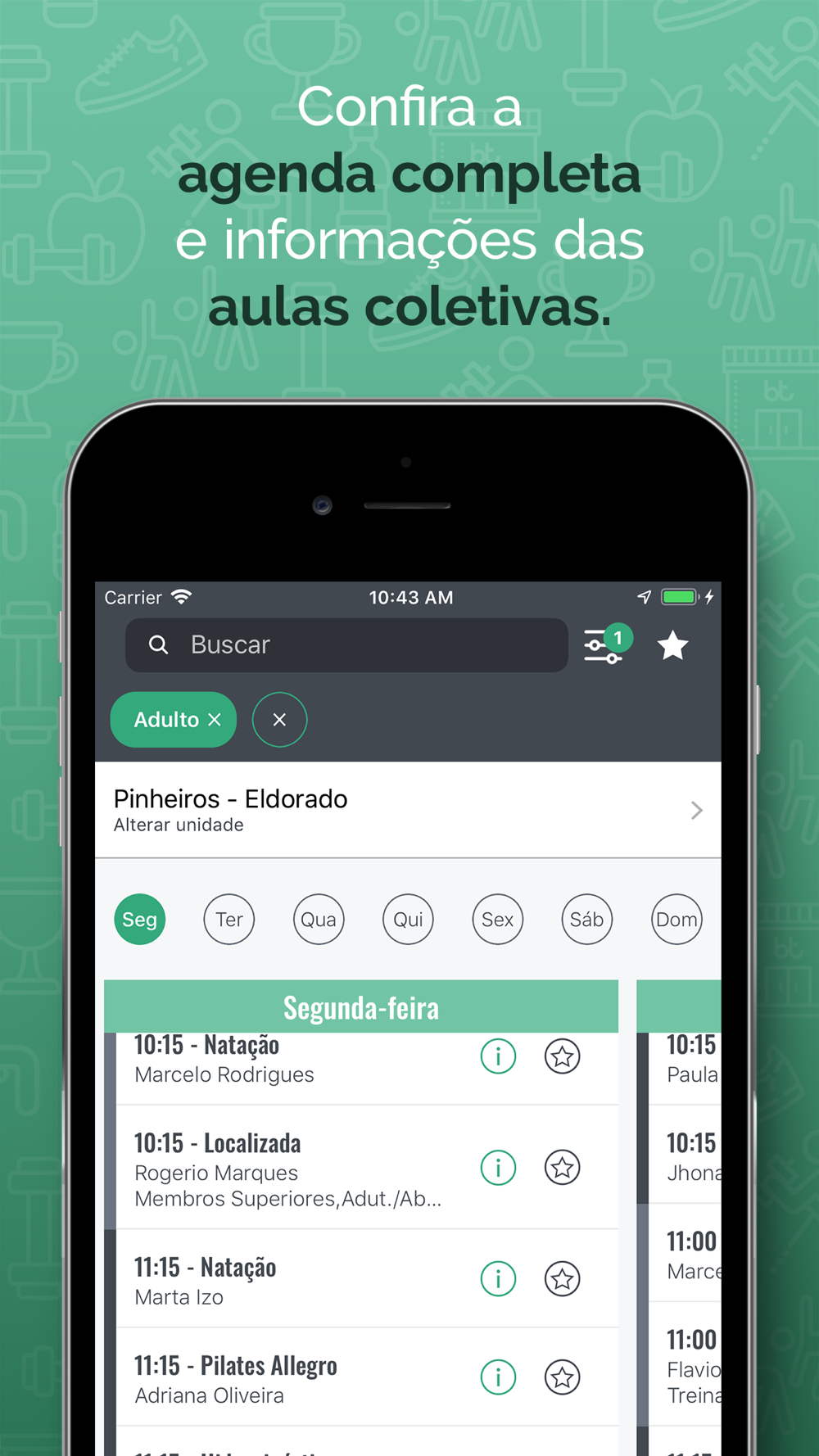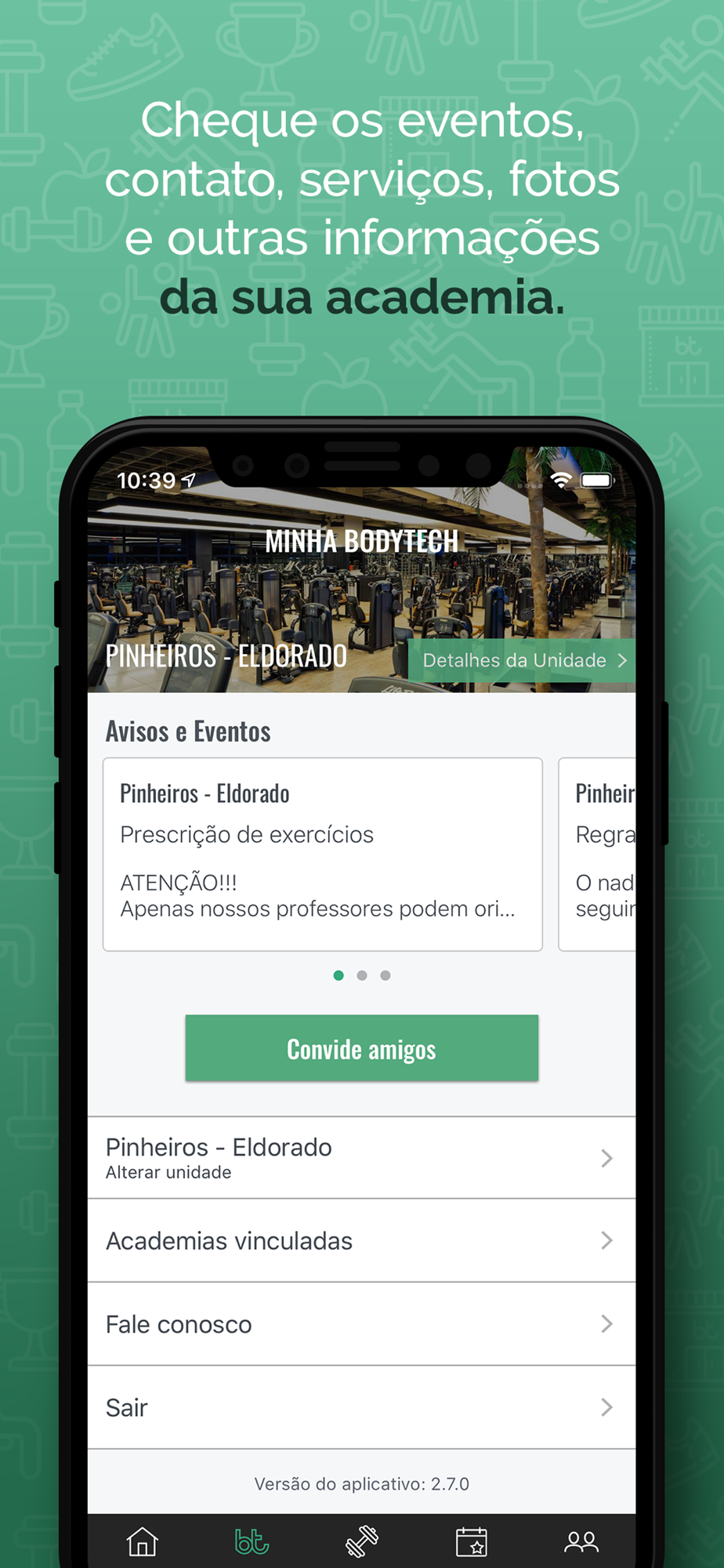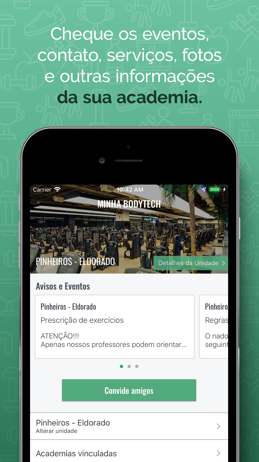 Checar os eventos, informações de contato, serviços, fotos e HORÁRIO DE FUNCIONAMENTO da sua academia.