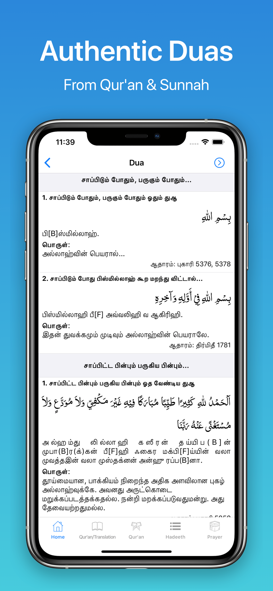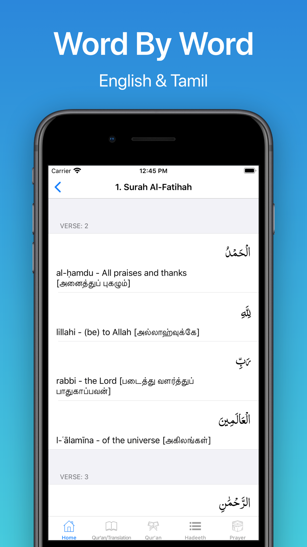 The Tamil Qur'an includes the most popular Qur'an translation in Tamil, two English Translations (Saheeh International & Muhsin Khan) and Transliteration in English and Tamil.