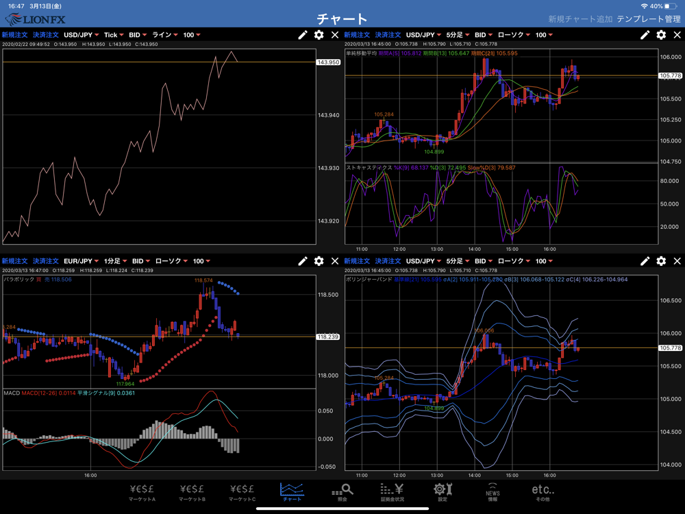 一度に4画面表示可能。また、足種やラインの種類、テクニカル分析も多種多様