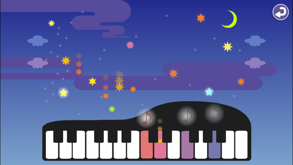 Touch any white key to enjoy a lovely animation and music. Three variations of music and animation will be played randomly. Interaction with stars in the sky in this mode is the same as in the manual play mode.