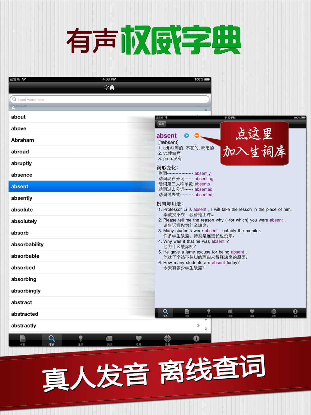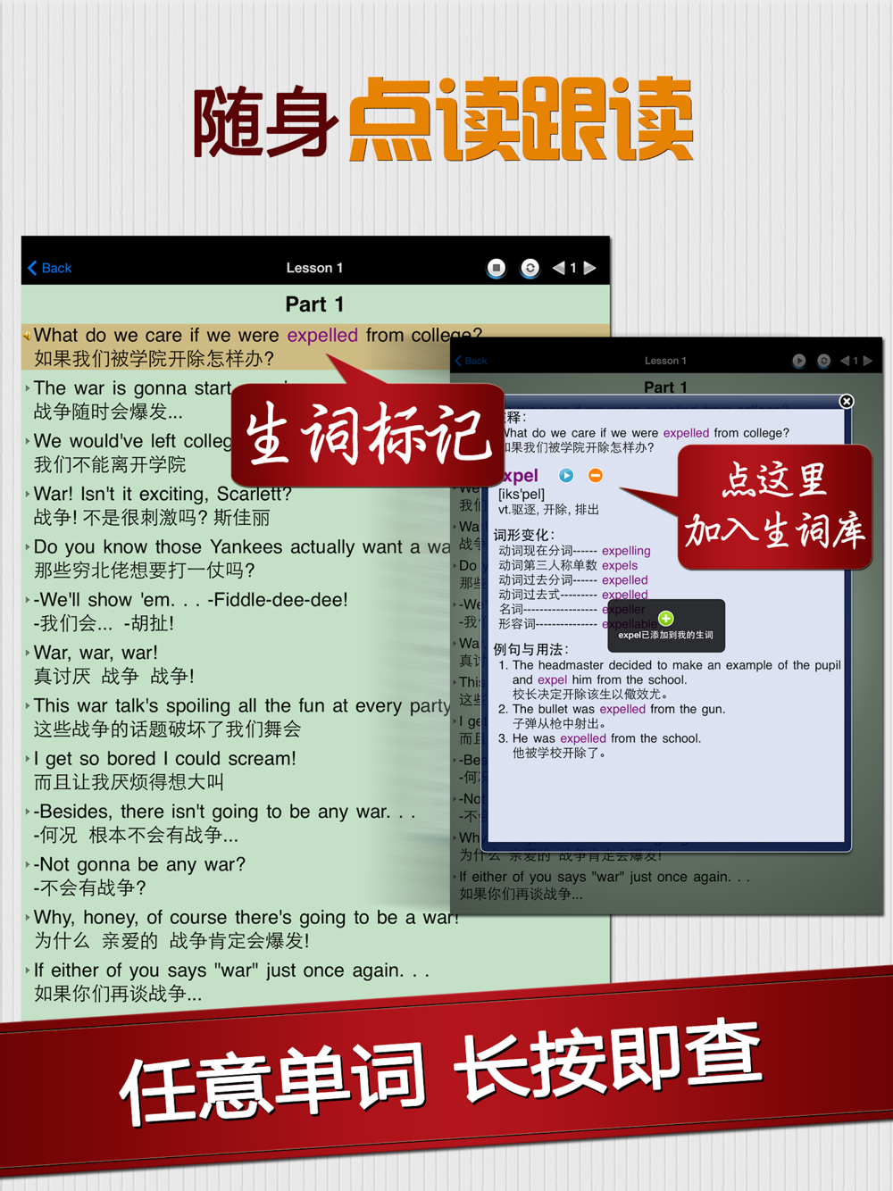 《乱世佳人》的每个句子都有标准的真人发音, 英汉对照. 每个英文单词都有详细的解释, 音标, 发音以及例句用法等, 在阅读的时候只需轻轻一按, 即可查阅, 配备强大的英汉全文字典, 哪里不懂点哪里.