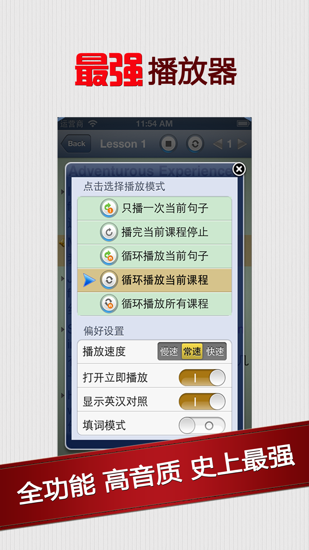 《乱世佳人》有多种播放模式: 单句, 单句循环, 全文, 全文循环, 全书循环, 支持后台播放, 定时睡眠, 可切换英汉对照模式与纯英文模式.
